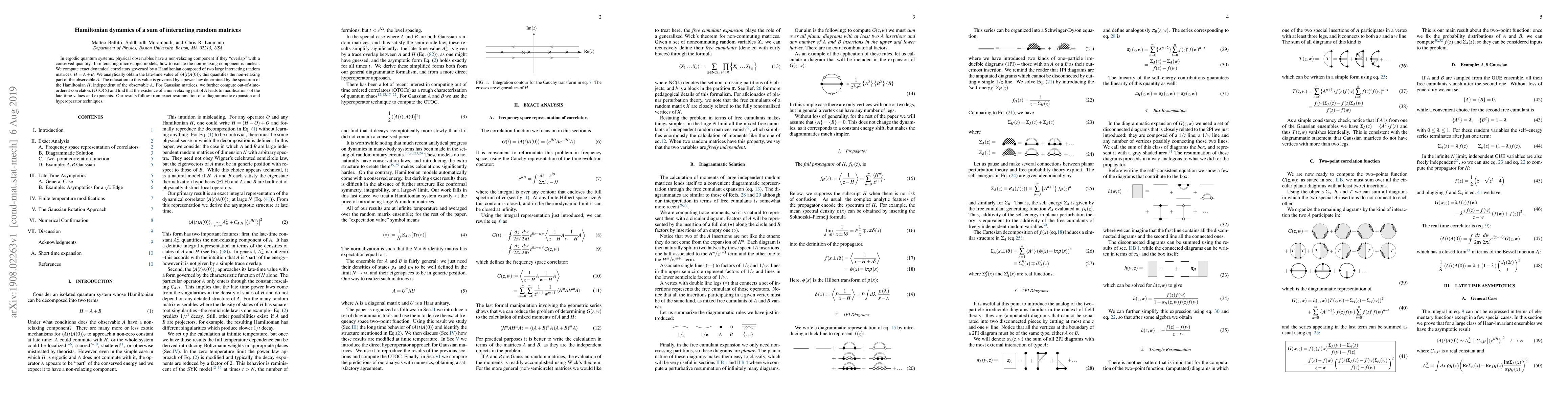 This research computes exact dynamical correlators for a Hamiltonian composed of two large interacting random matrices, revealing a non-relaxing component in observables. The study uses resummation of diagrammatic expansions and hyperoperator techniques, finding power-law governed relaxation and modified late-time values for Gaussian matrices' out-of-time-ordered-correlators.