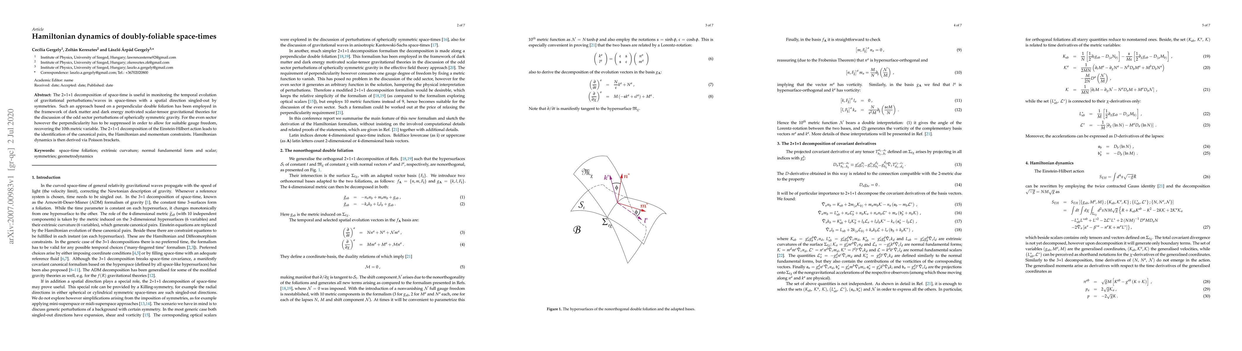 The 2+1+1 decomposition of space-time is useful in monitoring the temporal evolution of gravitational perturbations/waves in space-times with a spatial direction singled-out by symmetries. Such an approach based on a perpendicular double foliation has been employed in the framework of dark matter and dark energy motivated scalar-tensor gravitational theories for the discussion of the odd sector perturbations of spherically symmetric gravity. For the even sector however the perpendicularity has to be suppressed in order to allow for suitable gauge freedom, recovering the 10th metric variable. The 2+1+1 decomposition of the Einstein-Hilbert action leads to the identification of the canonical pairs, the Hamiltonian and momentum constraints. Hamiltonian dynamics is then derived via Poisson brackets.
