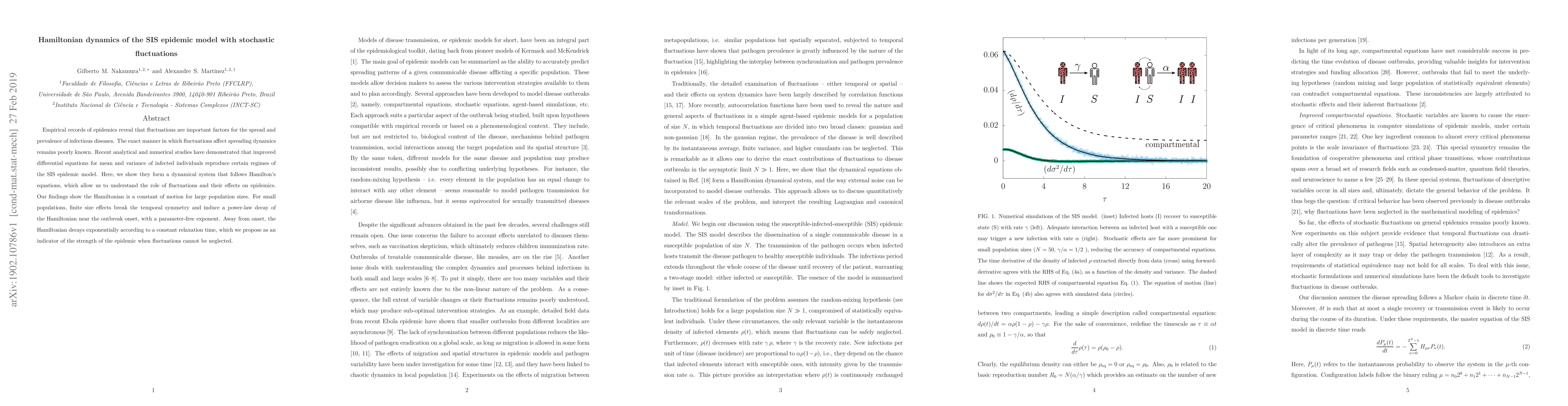 Empirical records of epidemics reveal that fluctuations are important factors for the spread and prevalence of infectious diseases. The exact manner in which fluctuations affect spreading dynamics remains poorly known. Recent analytical and numerical studies have demonstrated that improved differential equations for mean and variance of infected individuals reproduce certain regimes of the SIS epidemic model. Here, we show they form a dynamical system that follows Hamilton's equations, which allow us to understand the role of fluctuations and their effects on epidemics. Our findings show the Hamiltonian is a constant of motion for large population sizes. For small populations, finite size effects break the temporal symmetry and induce a power-law decay of the Hamiltonian near the outbreak onset, with a parameter-free exponent. Away from onset, the Hamiltonian decays exponentially according to a constant relaxation time, which we propose as a indicator of the strength of the epidemic when fluctuations cannot be neglected.