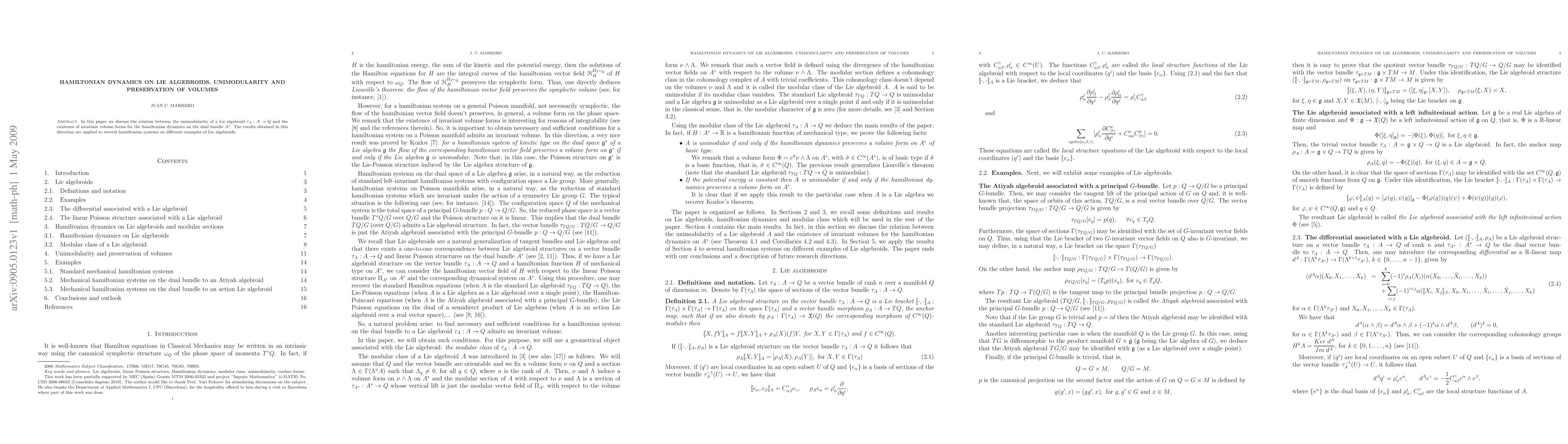 This paper explores the connection between the unimodularity of a Lie algebroid and the existence of invariant volume forms in Hamiltonian dynamics on the dual bundle. It applies these findings to various Hamiltonian systems on different Lie algebroid examples.