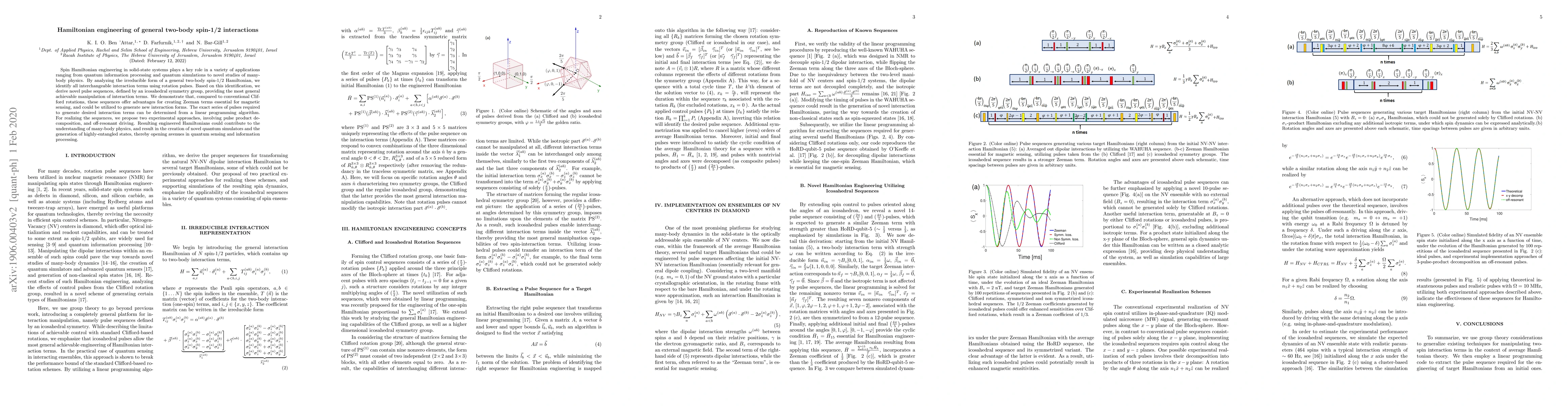 This paper explores the engineering of general two-body spin-1/2 interactions in solid-state systems through Hamiltonian manipulation using rotation pulses. It proposes novel pulse sequences based on icosahedral symmetry for optimal interaction term control, offering advantages over conventional methods for magnetic sensing and quantum information processing.