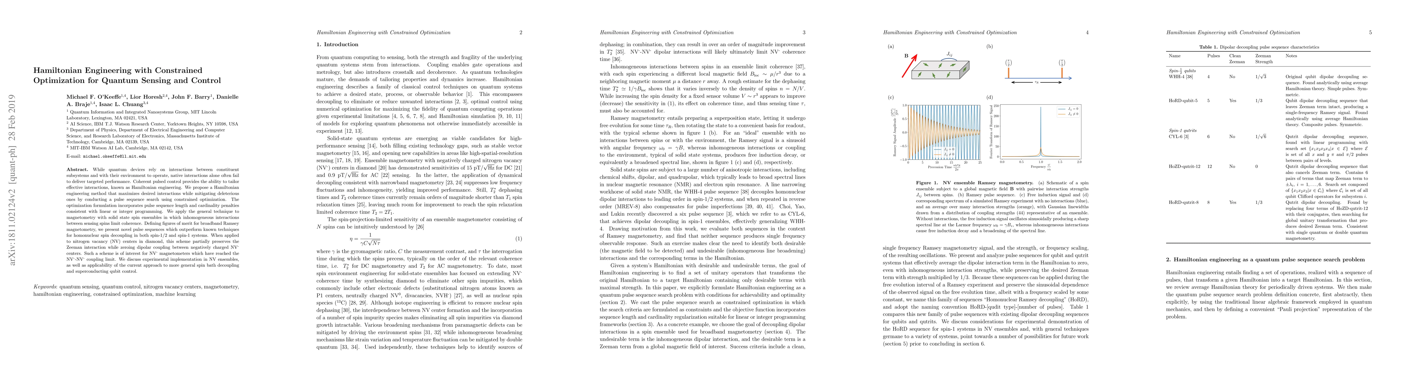 This paper proposes a Hamiltonian engineering method using constrained optimization to tailor effective interactions in quantum devices, particularly for quantum sensing and control. The technique maximizes desired interactions while minimizing unwanted ones, demonstrated through improved broadband Ramsey magnetometry in solid-state spin ensembles, especially for NV centers in diamond.