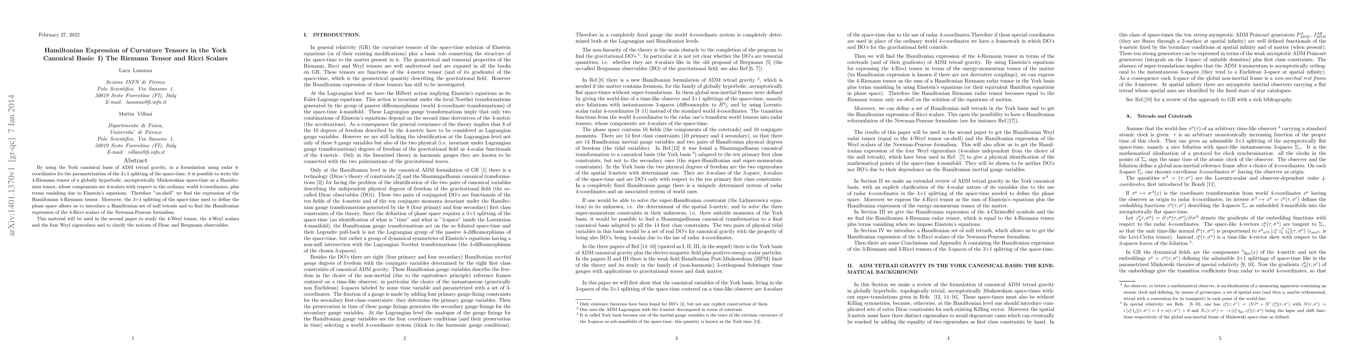 By using the York canonical basis of ADM tetrad gravity, in a formulation using radar 4-coordinates for the parametrization of the 3+1 splitting of the space-time, it is possible to write the 4-Riemann tensor of a globally hyperbolic, asymptotically Minkowskian space-time as a Hamiltonian tensor, whose components are 4-scalars with respect to the ordinary world 4-coordinates, plus terms vanishing due to Einstein's equations. Therefore "on-shell" we find the expression of the Hamiltonian 4-Riemann tensor. Moreover, the 3+1 splitting of the space-time used to define the phase space allows us to introduce a Hamiltonian set of null tetrads and to find the Hamiltonian expression of the 4-Ricci scalars of the Newman-Penrose formalism. This material will be used in the second paper to study the 4-Weyl tensor, the 4-Weyl scalars and the four Weyl eigenvalues and to clarify the notions of Dirac and Bergmann observables.