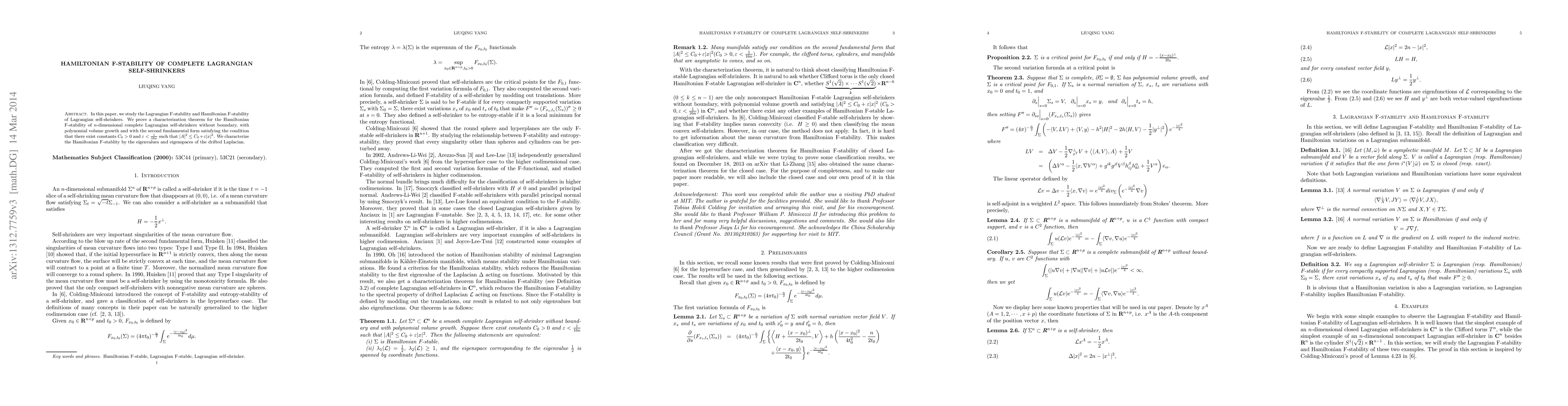 This paper investigates Lagrangian and Hamiltonian F-stability of complete Lagrangian self-shrinkers, proving a characterization theorem based on the eigenvalues and eigenspaces of the drifted Laplacian, under conditions on the second fundamental form and volume growth.
