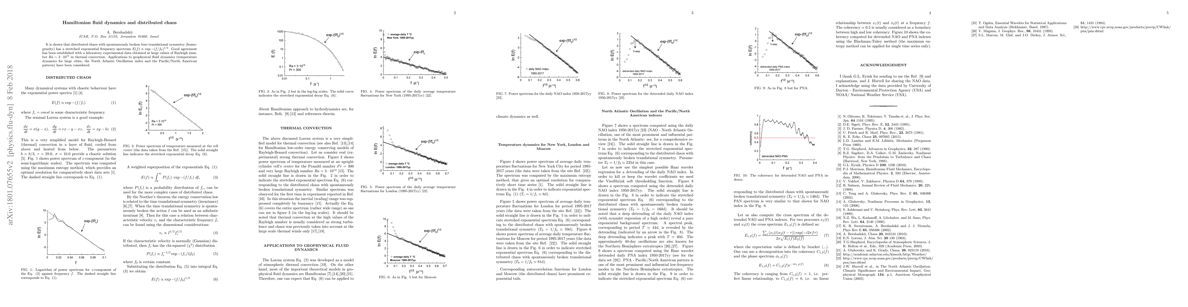 It is shown that distributed chaos with spontaneously broken time translational symmetry (homogeneity) has a stretched exponential frequency spectrum $E(f) \propto \exp-(f/f_0)^{1/2}$. Good agreement has been established with a laboratory experimental data obtained at large values of Rayleigh number $Ra \sim 3\cdot 10^{14}$ in thermal convection. Applications to geophysical fluid dynamics (temperature dynamics for large cities, the North Atlantic Oscillation index and the Pacific/North American pattern) have been considered.