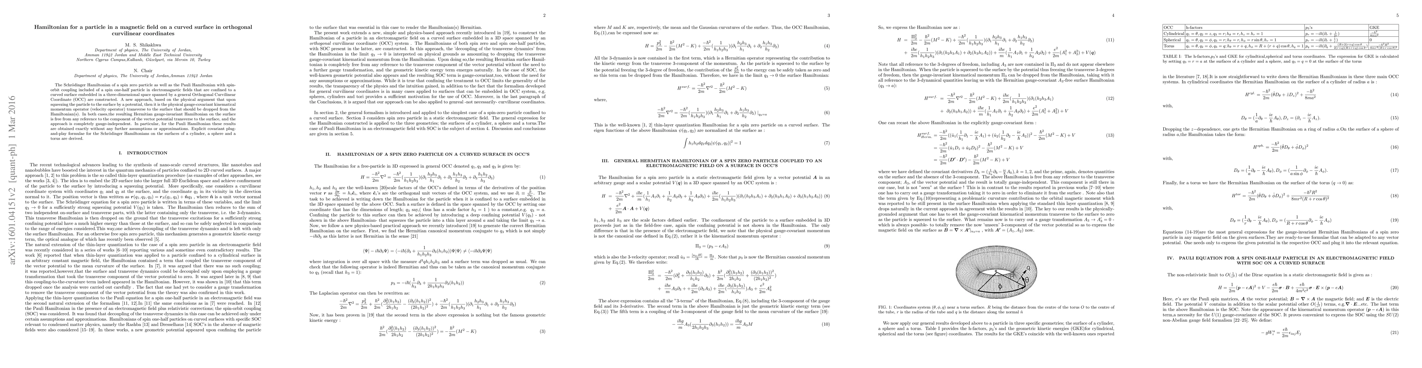 The Schr\"odinger Hamiltonian of a spin zero particle as well as the Pauli Hamiltonian with spin-orbit coupling included of a spin one-half particle in electromagnetic fields that are confined to a curved surface embedded in a three-dimensional space spanned by a general Orthogonal Curvilinear Coordinate (OCC) are constructed. A new approach, based on the physical argument that upon squeezing the particle to the surface by a potential, then it is the physical gauge-covariant kinematical momentum operator (velocity operator) transverse to the surface that should be dropped from the Hamiltonian(s). In both cases,the resulting Hermitian gauge-invariant Hamiltonian on the surface is free from any reference to the component of the vector potential transverse to the surface, and the approach is completely gauge-independent. In particular, for the Pauli Hamiltonian these results are obtained exactly without any further assumptions or approximations. Explicit covariant plug-and-play formulae for the Schr\"odinger Hamiltonians on the surfaces of a cylinder, a sphere and a torus are derived.