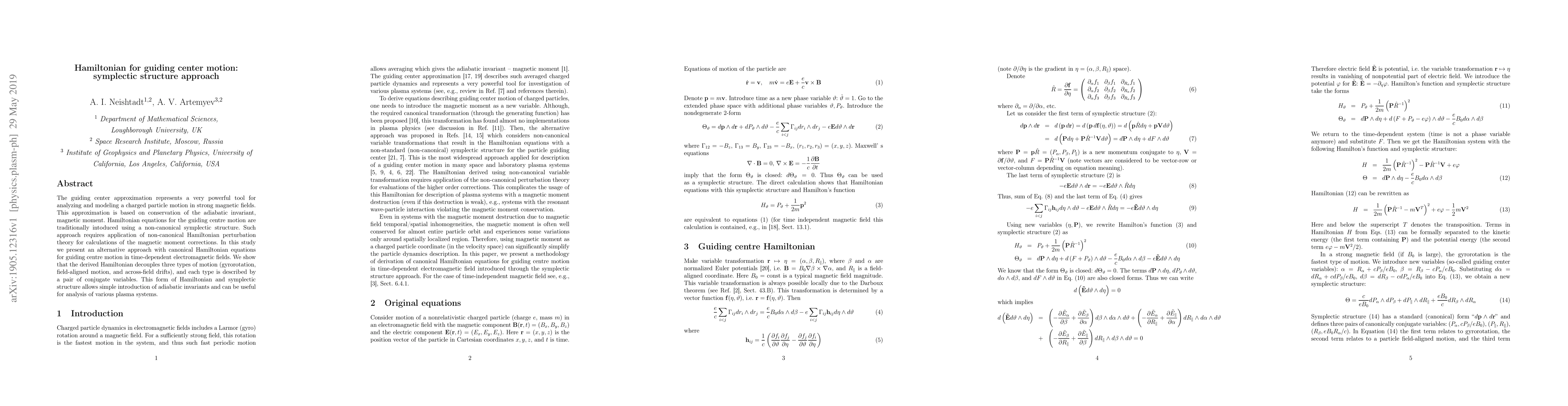 The guiding center approximation represents a very powerful tool for analyzing and modeling a charged particle motion in strong magnetic fields. This approximation is based on conservation of the adiabatic invariant, magnetic moment. Hamiltonian equations for the guiding centre motion are traditionally intoduced using a non-canonical symplectic structure. Such approach requires application of non-canonical Hamiltonian perturbation theory for calculations of the magnetic moment corrections. In this study we present an alternative approach with canonical Hamiltonian equations for guiding centre motion in time-dependent electromagnetic fields. We show that the derived Hamiltonian decouples three types of motion (gyrorotation, field-aligned motion, and across-field drifts), and each type is described by a pair of conjugate variables. This form of Hamiltonian and symplectic structure allows simple introduction of adiabatic invariants and can be useful for analysis of various plasma systems.