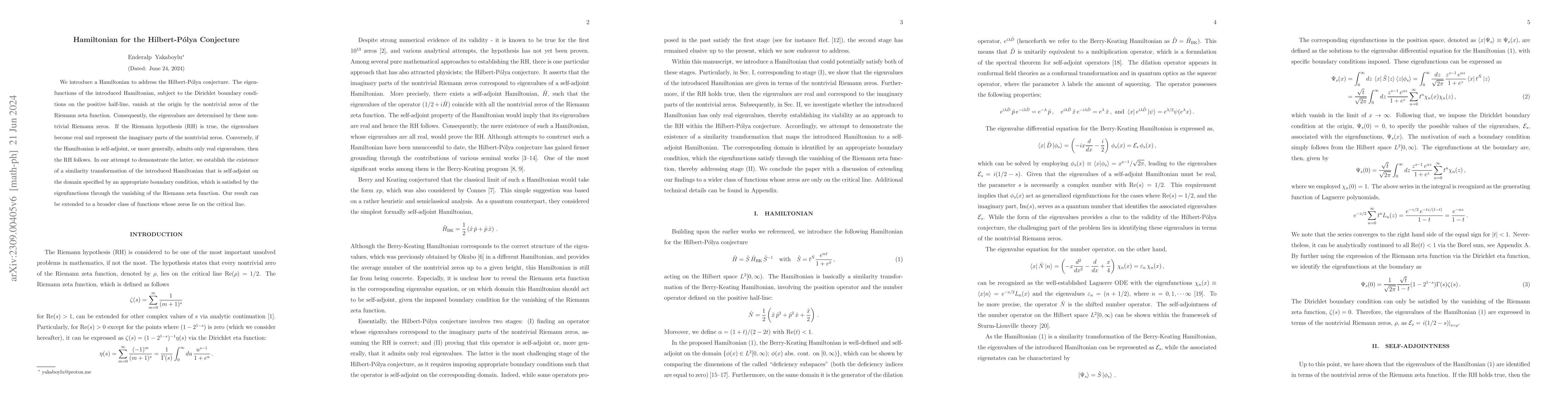 The paper introduces a Hamiltonian whose eigenfunctions, subject to specific boundary conditions, correspond to the nontrivial zeros of the Riemann zeta function. If the Riemann hypothesis holds, the eigenvalues become real and represent these zeros, while proving self-adjointness of the Hamiltonian implies the hypothesis.