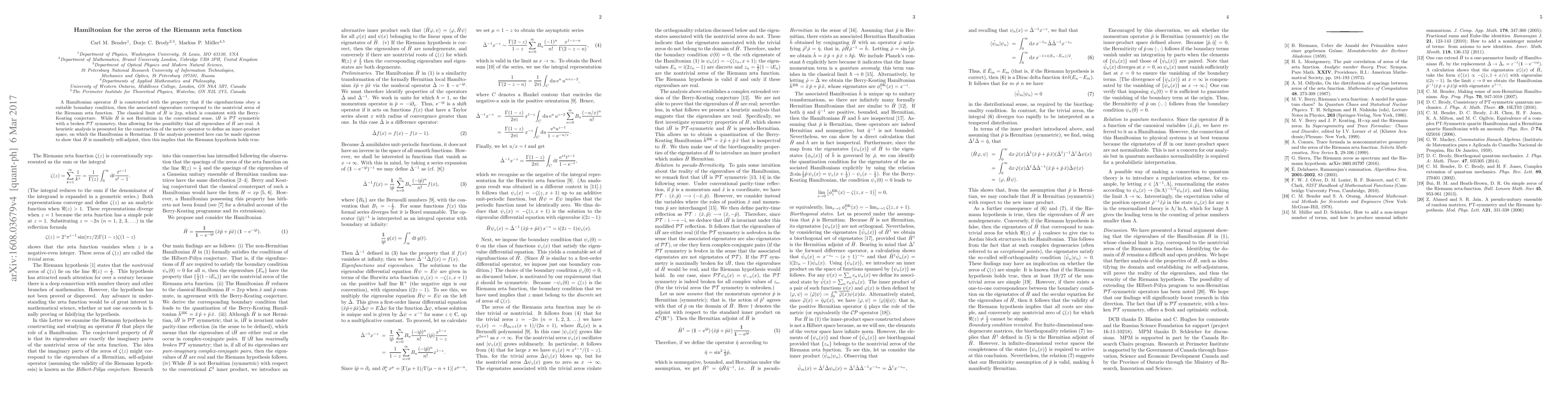 Researchers construct a Hamiltonian operator that is linked to the nontrivial zeros of the Riemann zeta function, potentially resolving the Riemann hypothesis if proven self-adjoint.