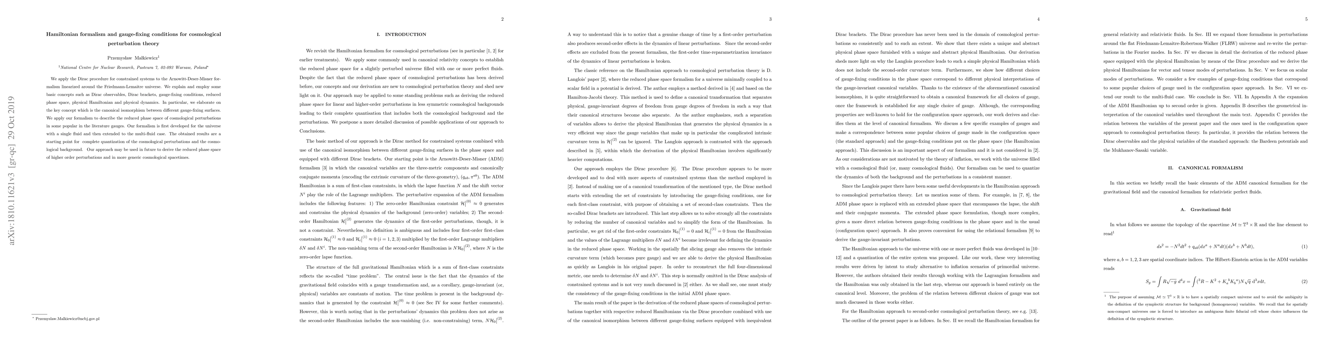This paper applies the Dirac procedure to the Arnowitt-Deser-Misner formalism for cosmological perturbation theory, focusing on gauge-fixing conditions and the canonical isomorphism between different gauge-fixing surfaces. It extends the formalism to both single and multi-fluid universes, laying the groundwork for future quantization studies.