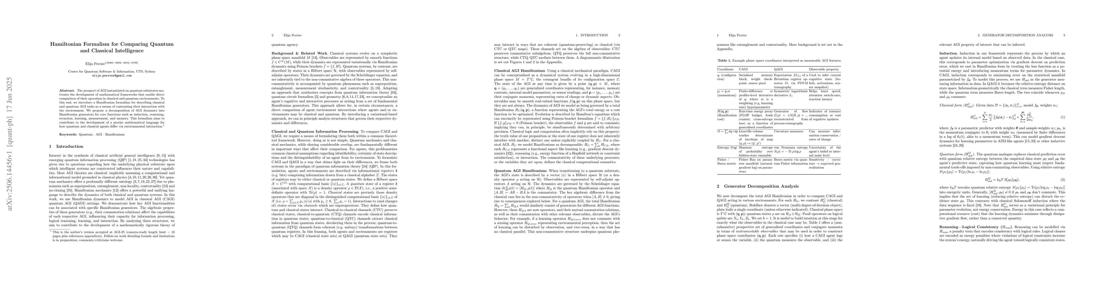 The prospect of AGI instantiated on quantum substrates motivates the development of mathematical frameworks that enable direct comparison of their operation in classical and quantum environments. To this end, we introduce a Hamiltonian formalism for describing classical and quantum AGI tasks as a means of contrasting their interaction with the environment. We propose a decomposition of AGI dynamics into Hamiltonian generators for core functions such as induction, reasoning, recursion, learning, measurement, and memory. This formalism aims to contribute to the development of a precise mathematical language for how quantum and classical agents differ via environmental interaction.
