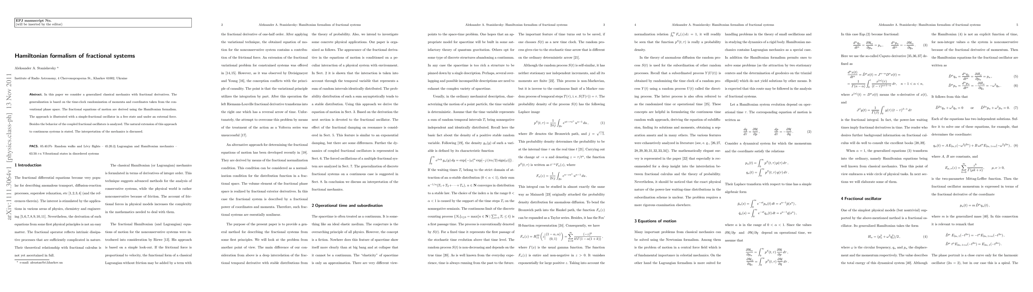 In this paper we consider a generalized classical mechanics with fractional derivatives. The generalization is based on the time-clock randomization of momenta and coordinates taken from the conventional phase space. The fractional equations of motion are derived using the Hamiltonian formalism. The approach is illustrated with a simple-fractional oscillator in a free state and under an external force. Besides the behavior of the coupled fractional oscillators is analyzed. The natural extension of this approach to continuous systems is stated. The interpretation of the mechanics is discussed.