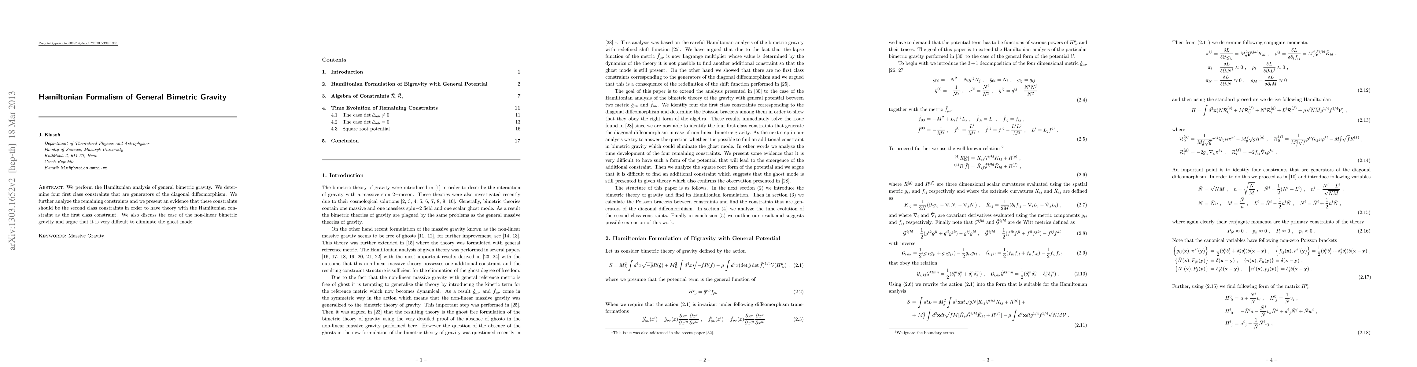 This paper conducts a Hamiltonian analysis of general bimetric gravity, identifying four first-class constraints and suggesting that the remaining constraints are second-class, supporting a theory with a first-class Hamiltonian constraint. It also highlights the challenge of eliminating ghost modes in non-linear bimetric gravity.