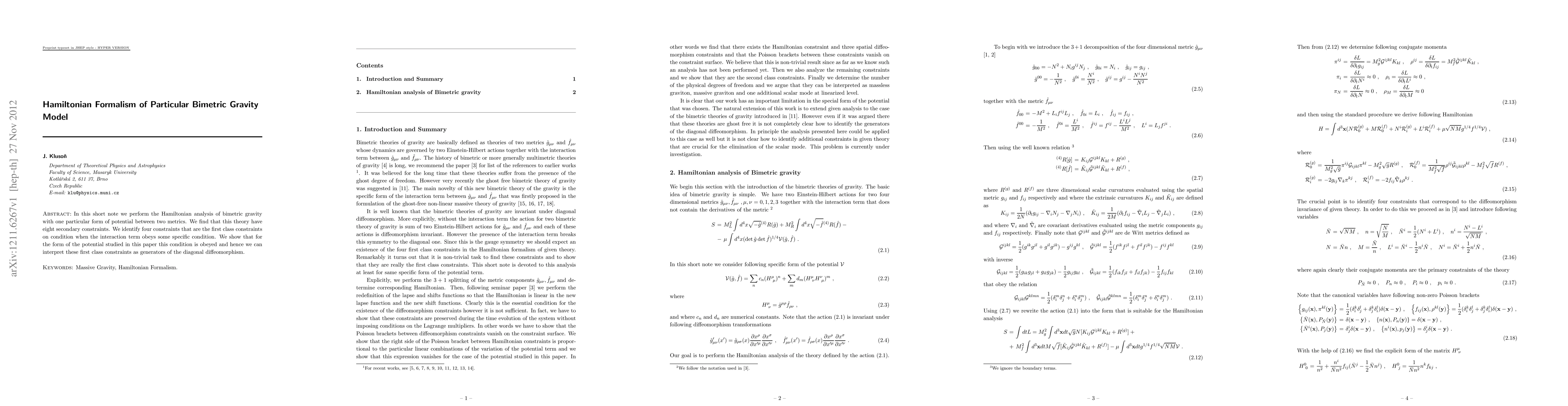 The paper presents a detailed Hamiltonian analysis of a bimetric gravity model, identifying first-class constraints and their relation to diagonal diffeomorphisms.