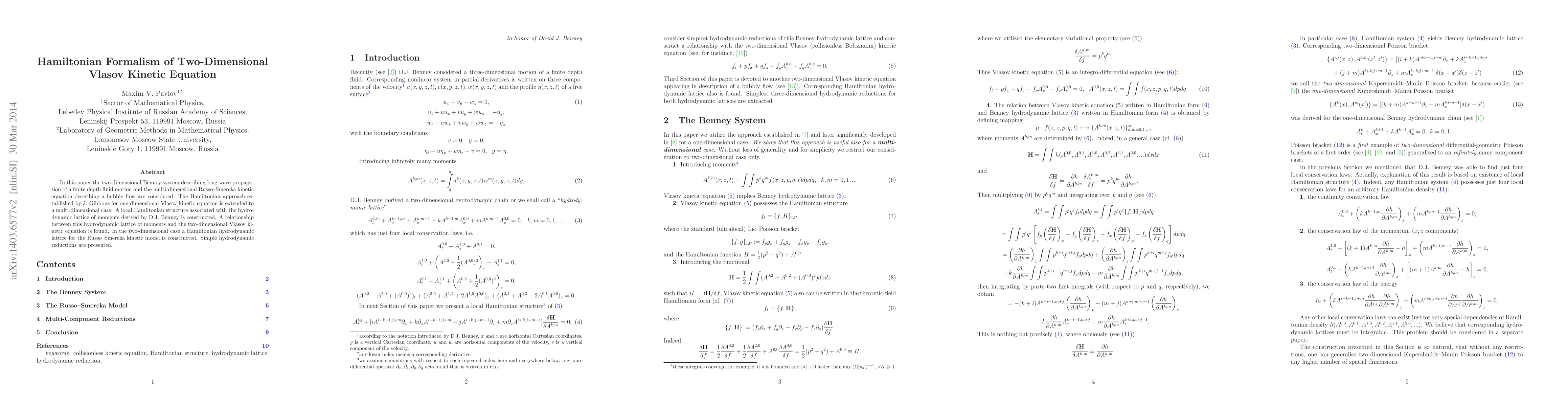 In this paper the two-dimensional Benney system describing long wave propagation of a finite depth fluid motion and the multi-dimensional Russo--Smereka kinetic equation describing a bubbly flow are considered. The Hamiltonian approach established by J. Gibbons for one-dimensional Vlasov kinetic equation is extended to a multi-dimensional case. A local Hamiltonian structure associated with the hydrodynamic lattice of moments derived by D.J. Benney is constructed. A relationship between this hydrodynamic lattice of moments and the two-dimensional Vlasov kinetic equation is found. In the two-dimensional case a Hamiltonian hydrodynamic lattice for the Russo--Smereka kinetic model is constructed. Simple hydrodynamic reductions are presented.