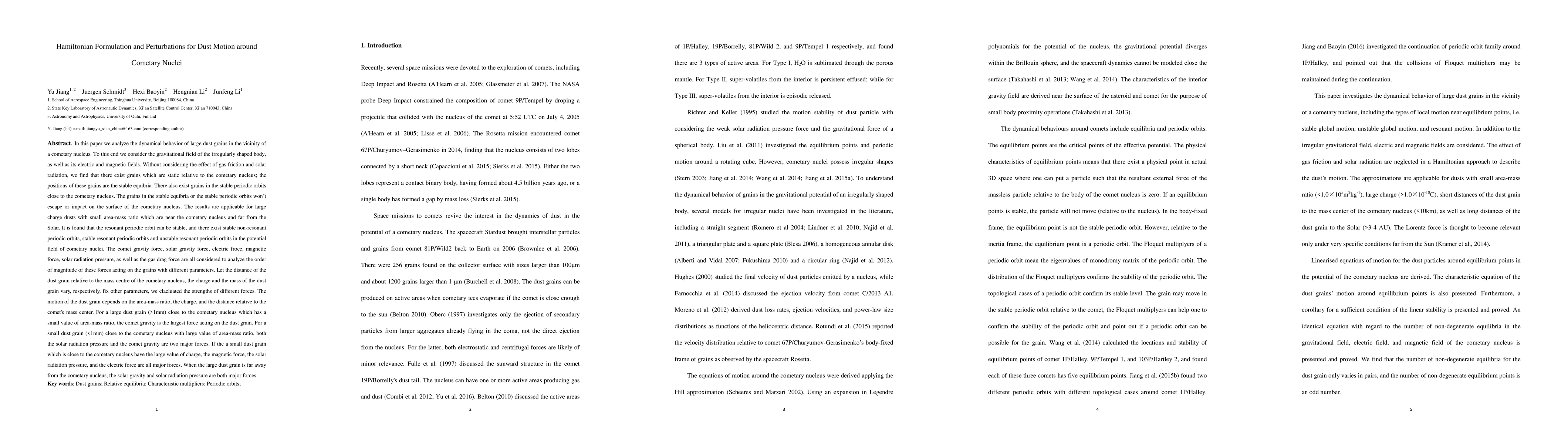 This paper investigates the dynamics of large dust grains near cometary nuclei, considering gravitational, electric, and magnetic fields. It identifies stable equilibria and periodic orbits for dust grains, unaffected by gas friction and solar radiation, and analyzes the forces acting on these grains to determine their stability.