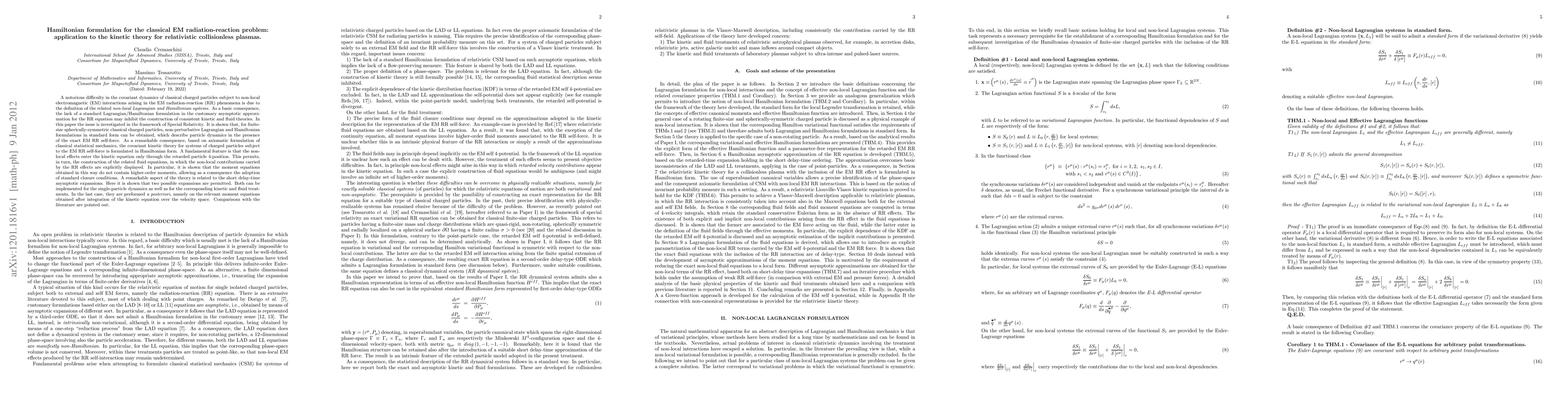 This paper develops a Hamiltonian formulation for the classical EM radiation-reaction problem, providing a non-perturbative Lagrangian and Hamiltonian framework for finite-size charged particles. It formulates a covariant kinetic theory for relativistic collisionless plasmas, ensuring non-local effects are incorporated through the retarded particle 4-position, facilitating the construction of non-local fluid equations without higher-order moments.