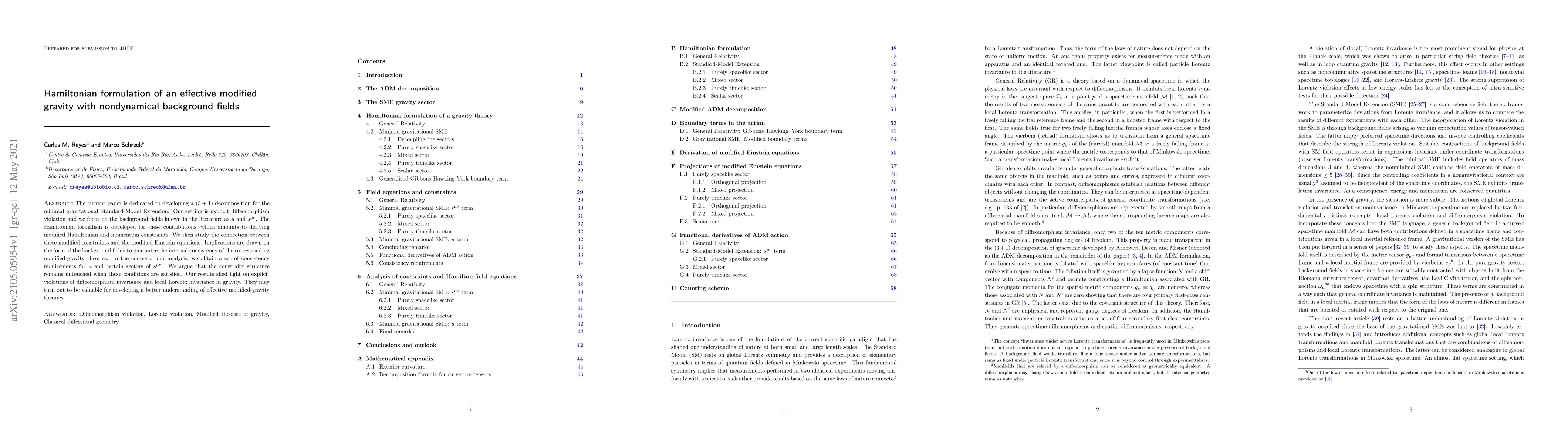 The current paper is dedicated to developing a (3+1) decomposition for the minimal gravitational Standard-Model Extension. Our setting is explicit diffeomorphism violation and we focus on the background fields known in the literature as $u$ and $s^{\mu\nu}$. The Hamiltonian formalism is developed for these contributions, which amounts to deriving modified Hamiltonian and momentum constraints. We then study the connection between these modified constraints and the modified Einstein equations. Implications are drawn on the form of the background fields to guarantee the internal consistency of the corresponding modified-gravity theories. In the course of our analysis, we obtain a set of consistency requirements for $u$ and certain sectors of $s^{\mu\nu}$. We argue that the constraint structure remains untouched when these conditions are satisfied. Our results shed light on explicit violations of diffeomorphism invariance and local Lorentz invariance in gravity. They may turn out to be valuable for developing a better understanding of effective modified-gravity theories.