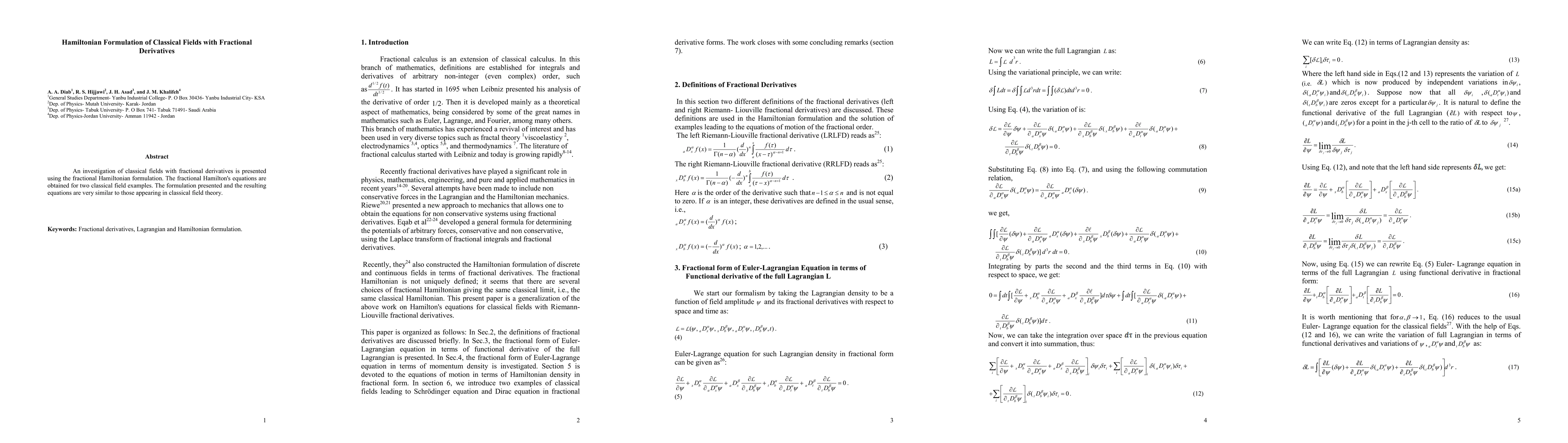 The paper investigates classical fields with fractional derivatives via the fractional Hamiltonian formulation, deriving fractional Hamilton's equations for two examples that resemble classical field theory formulations.