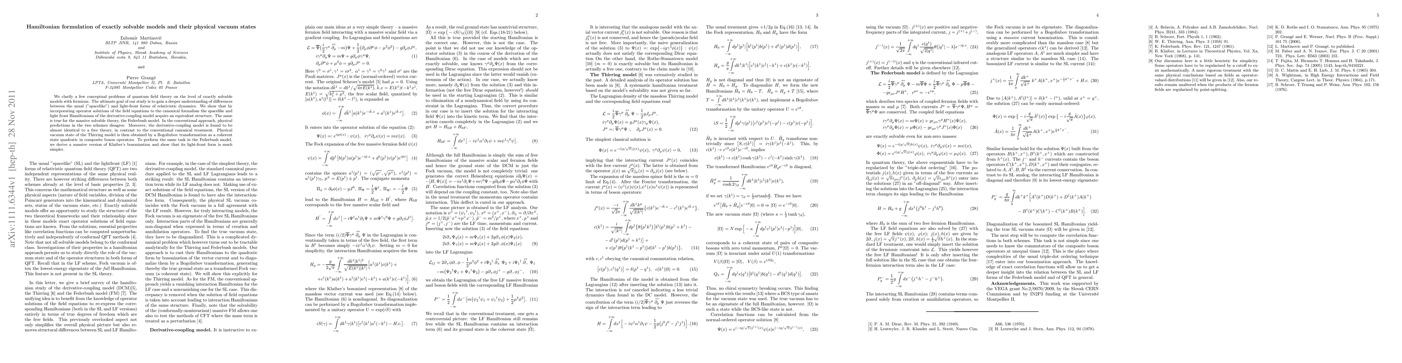 We clarify a few conceptual problems of quantum field theory on the level of exactly solvable models with fermions. The ultimate goal of our study is to gain a deeper understanding of differences between the usual ("spacelike") and light-front forms of relativistic dynamics. We show that by incorporating solutions of the operator field equations to the canonical formalism the spacelike and light front Hamiltonians of the derivative-coupling model acquire an equivalent structure. The same is true for the massive solvable theory, the Federbush model. In the conventional approach, the physical predictions in the two schemes disagree. Moreover, the derivative-coupling model is found to be almost identical to a free theory, in contrast to the conventional canonical treatment. Physical vacuum state of the Thirring model is then obtained by a Bogoliubov transformation as a coherent state quadratic in composite boson operators. To perform the same task in the Federbush model, we derive a massive version of Klaiber's bosonization and show that its light-front form is much simpler.
