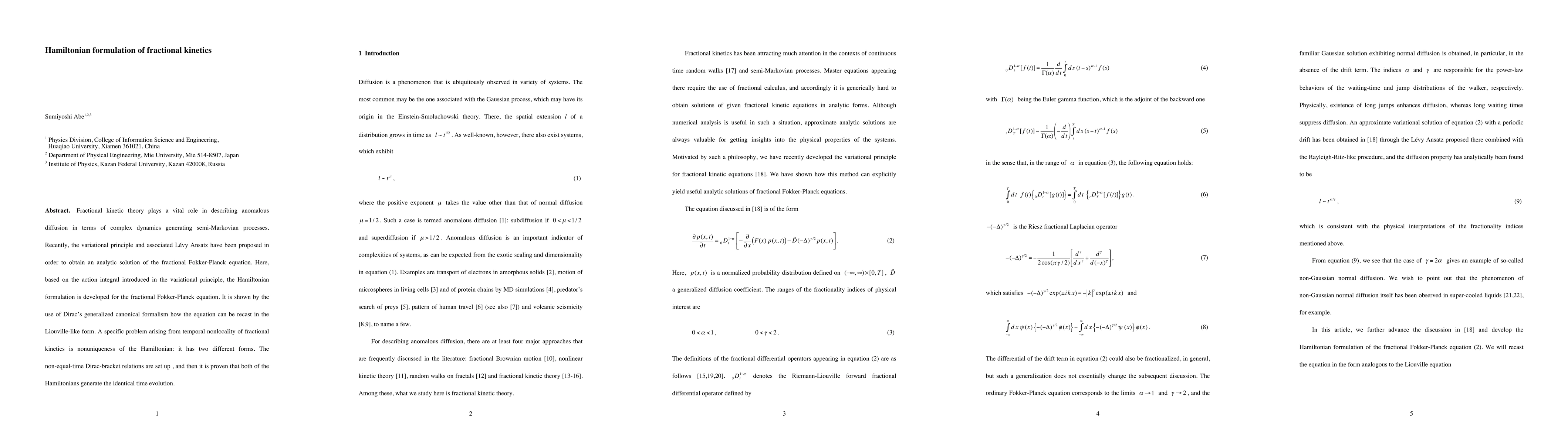 Fractional kinetic theory plays a vital role in describing anomalous diffusion in terms of complex dynamics generating semi-Markovian processes. Recently, the variational principle and associated Levy Ansatz have been proposed in order to obtain an analytic solution of the fractional Fokker-Planck equation. Here, based on the action integral introduced in the variational principle, the Hamiltonian formulation is developed for the fractional Fokker-Planck equation. It is shown by the use of Dirac's generalized canonical formalism how the equation can be recast in the Liouville-like form. A specific problem arising from temporal nonlocality of fractional kinetics is nonuniqueness of the Hamiltonian: it has two different forms. The non-equal-time Dirac-bracket relations are set up , and then it is proven that both of the Hamiltonians generate the identical time evolution.