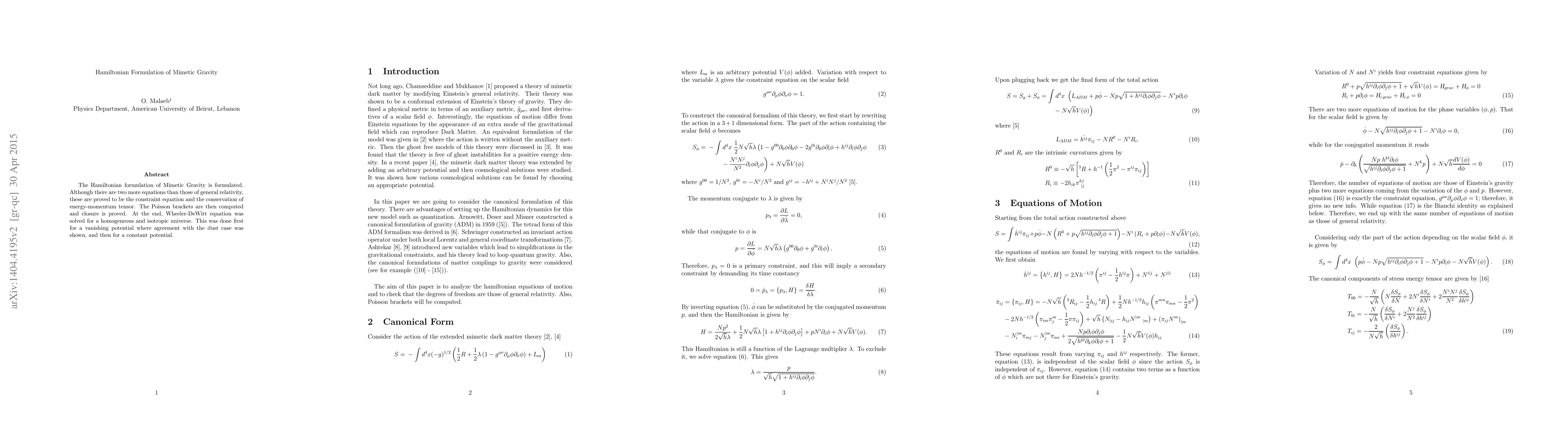 The paper formulates the Hamiltonian version of Mimetic Gravity, demonstrating its constraints and energy-momentum conservation, and solves the Wheeler-DeWitt equation for a homogeneous and isotropic universe, showing consistency with the dust case and a constant potential.