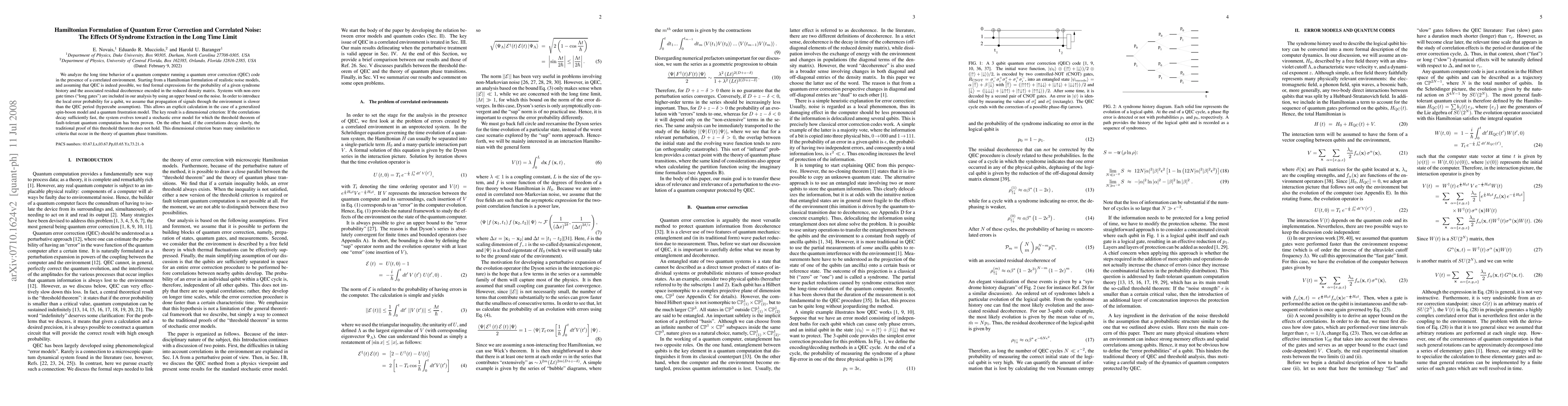 This paper investigates the long-term behavior of quantum computers under correlated noise using a Hamiltonian formulation, revealing that rapid decay of correlations leads to a stochastic error model supporting fault-tolerant quantum computation, while slow decay invalidates traditional threshold proofs.
