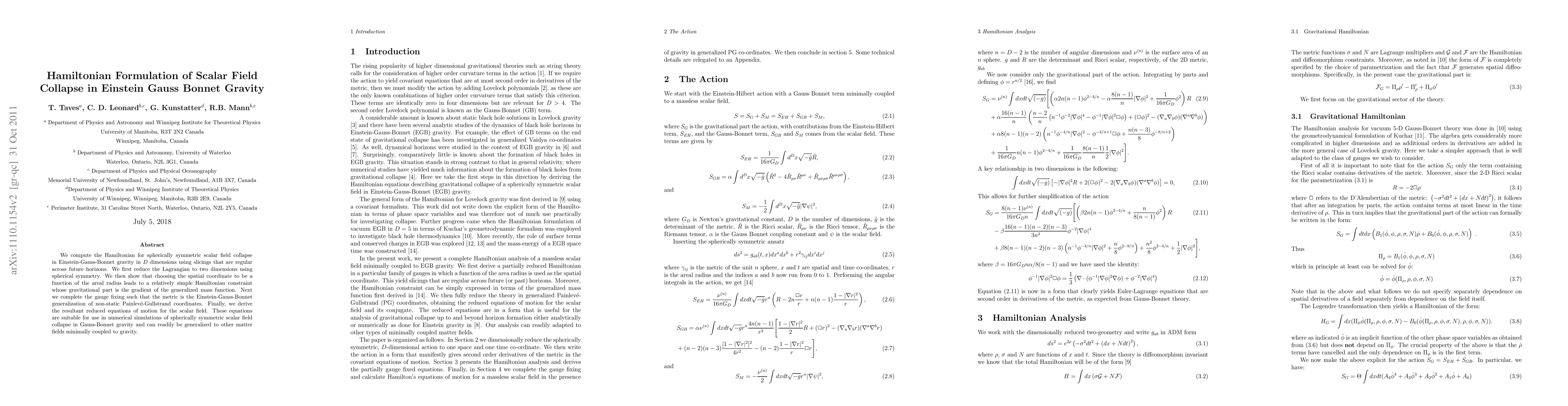 We compute the Hamiltonian for spherically symmetric scalar field collapse in Einstein-Gauss-Bonnet gravity in D dimensions using slicings that are regular across future horizons. We first reduce the Lagrangian to two dimensions using spherical symmetry. We then show that choosing the spatial coordinate to be a function of the areal radius leads to a relatively simple Hamiltonian constraint whose gravitational part is the gradient of the generalized mass function. Next we complete the gauge fixing such that the metric is the Einstein-Gauss-Bonnet generalization of non-static Painleve-Gullstrand coordinates. Finally, we derive the resultant reduced equations of motion for the scalar field. These equations are suitable for use in numerical simulations of spherically symmetric scalar field collapse in Gauss-Bonnet gravity and can readily be generalized to other matter fields minimally coupled to gravity.