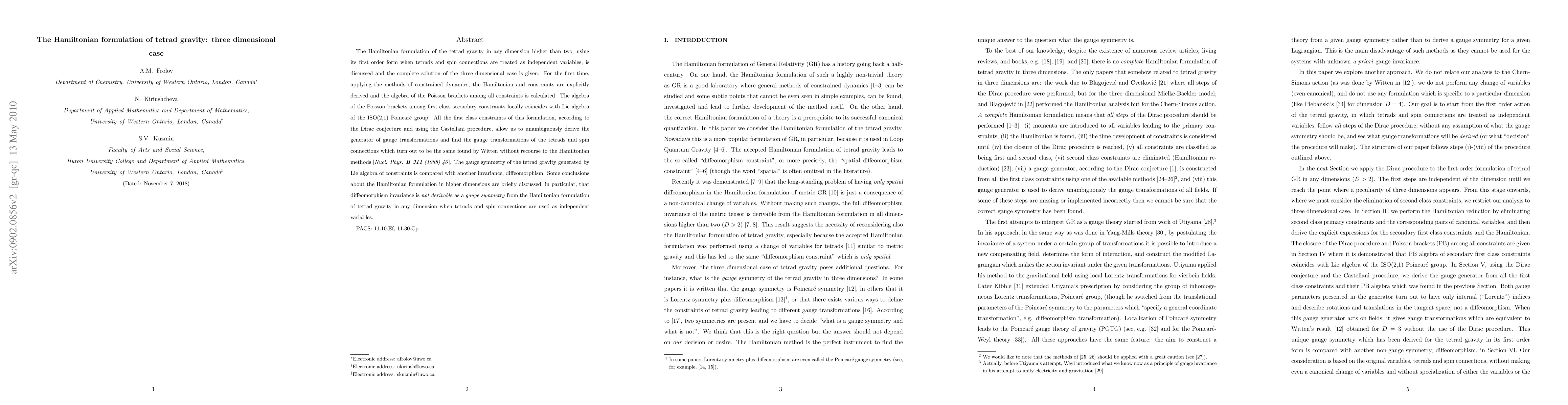 This paper presents a Hamiltonian formulation of three-dimensional tetrad gravity, deriving the first-order formulation and constraints, and shows that the algebra of Poisson brackets among constraints aligns with the ISO(2,1) Poincaré group. It concludes that diffeomorphism invariance cannot be derived as a gauge symmetry from the Hamiltonian formulation.