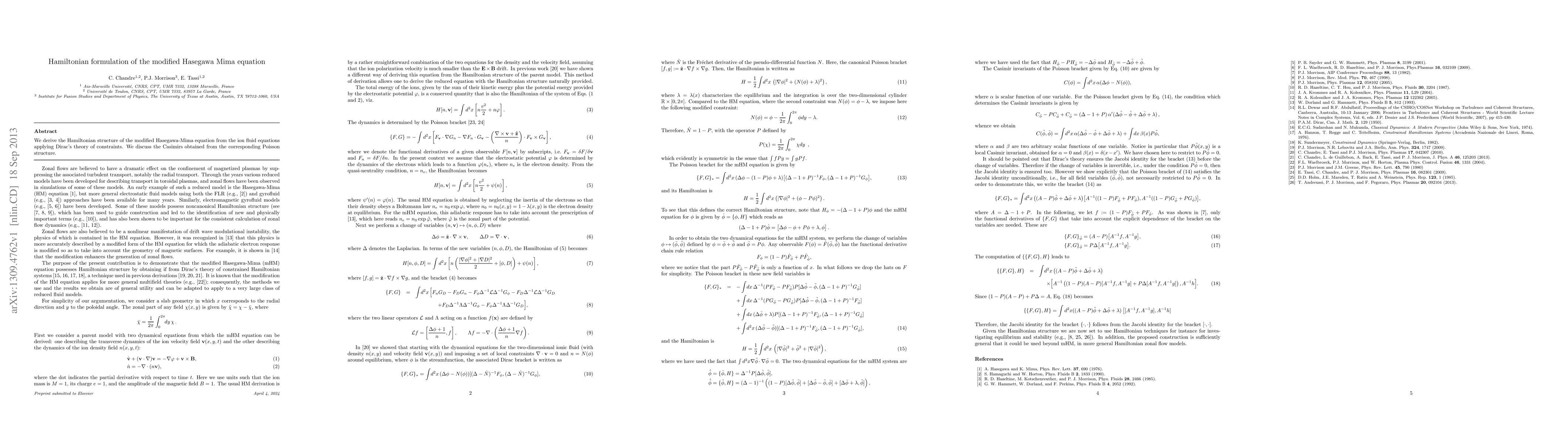 This paper derives the Hamiltonian structure of the modified Hasegawa-Mima equation using Dirac's theory of constraints and examines the Casimirs derived from the associated Poisson structure. The study highlights the equation's relevance in plasma physics.