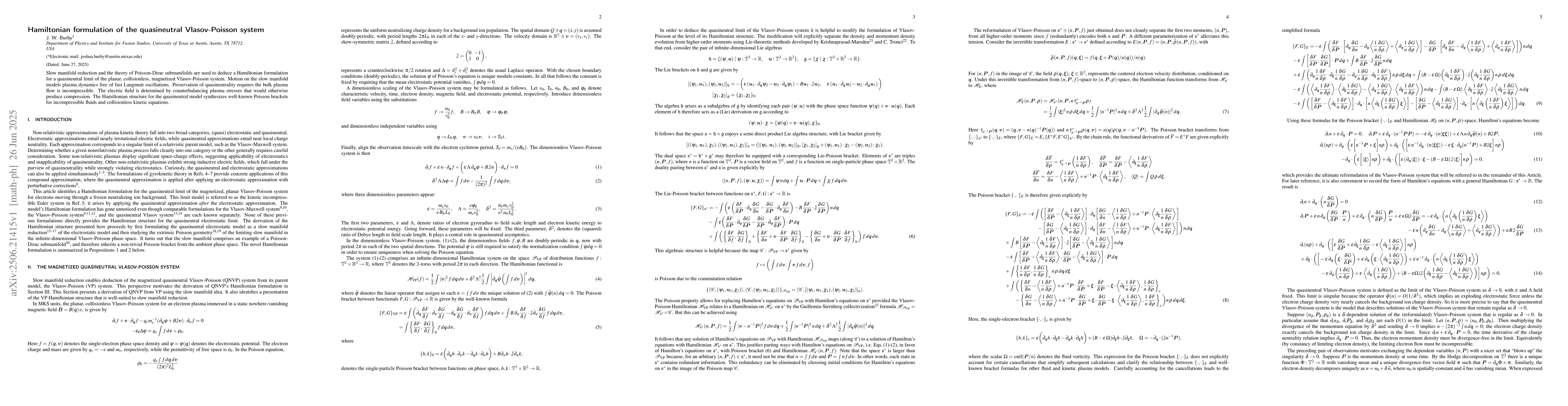 This work provides a rigorous geometric and Hamiltonian foundation for quasineutral plasma models, facilitating analysis of stability, invariants, and long-term dynamics relevant to plasma physics and controlled fusion research.