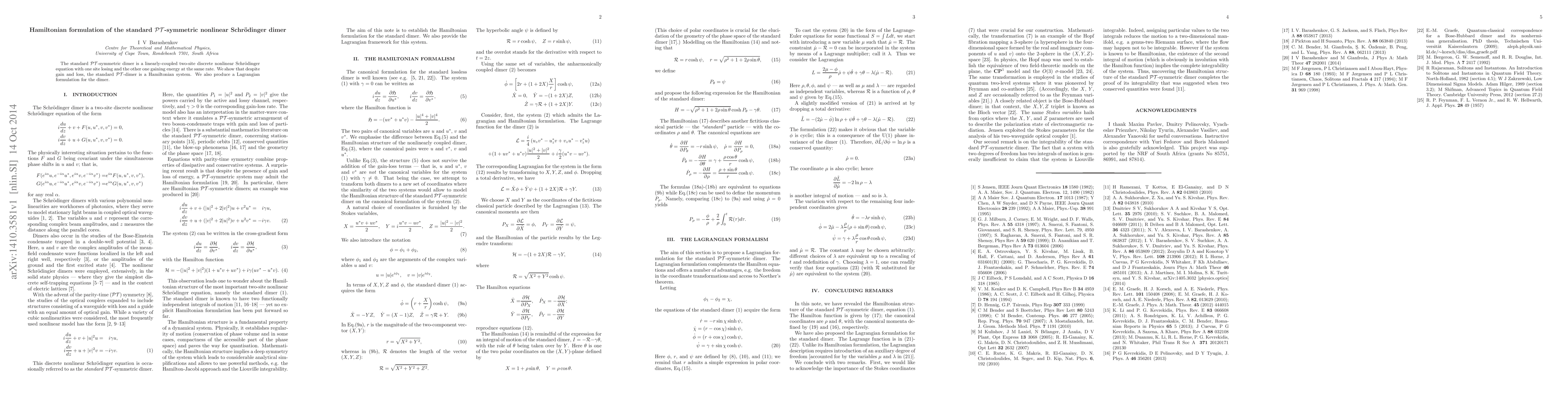 The standard $\mathcal{PT}$-symmetric dimer is a linearly-coupled two-site discrete nonlinear Schr\"odinger equation with one site losing and the other one gaining energy at the same rate. We show that despite gain and loss, the standard $\mathcal{PT}$-dimer is a Hamiltonian system. We also produce a Lagrangian formulation for the dimer.