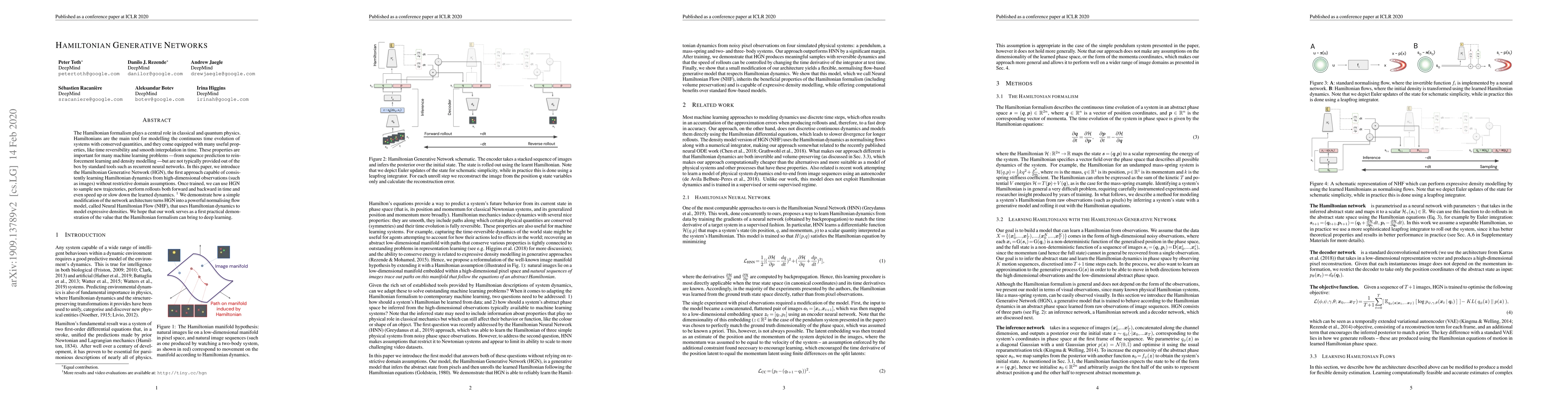 The Hamiltonian formalism plays a central role in classical and quantum physics. Hamiltonians are the main tool for modelling the continuous time evolution of systems with conserved quantities, and they come equipped with many useful properties, like time reversibility and smooth interpolation in time. These properties are important for many machine learning problems - from sequence prediction to reinforcement learning and density modelling - but are not typically provided out of the box by standard tools such as recurrent neural networks. In this paper, we introduce the Hamiltonian Generative Network (HGN), the first approach capable of consistently learning Hamiltonian dynamics from high-dimensional observations (such as images) without restrictive domain assumptions. Once trained, we can use HGN to sample new trajectories, perform rollouts both forward and backward in time and even speed up or slow down the learned dynamics. We demonstrate how a simple modification of the network architecture turns HGN into a powerful normalising flow model, called Neural Hamiltonian Flow (NHF), that uses Hamiltonian dynamics to model expressive densities. We hope that our work serves as a first practical demonstration of the value that the Hamiltonian formalism can bring to deep learning.