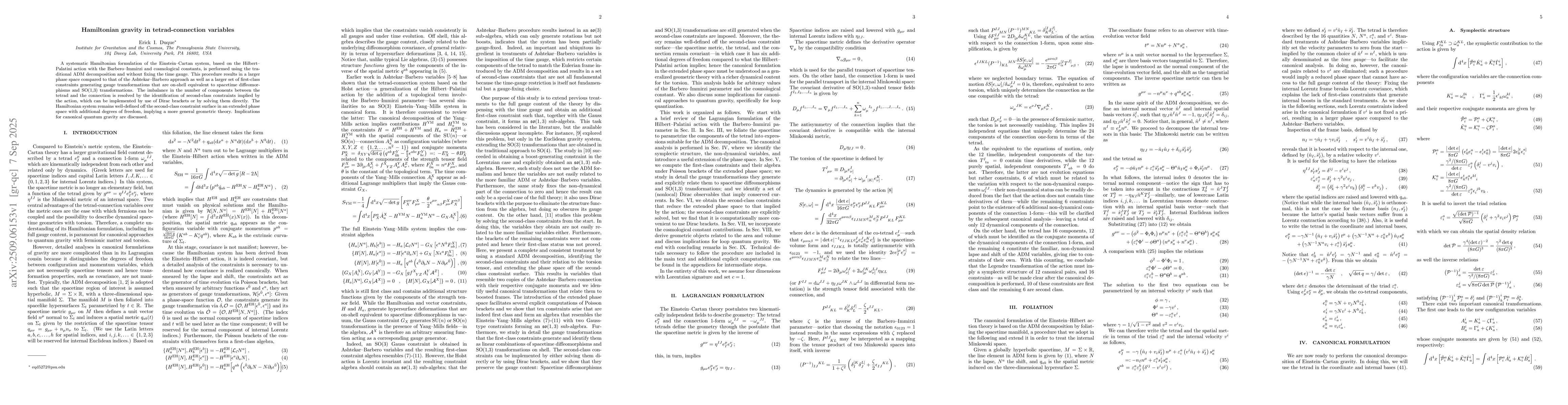 A systematic Hamiltonian formulation of the Einstein--Cartan system, based on the Hilbert--Palatini action with the Barbero--Immirzi and cosmological constants, is performed using the traditional ADM decomposition and without fixing the time gauge. This procedure results in a larger phase space compared to that of the Ashtekar--Barbero approach as well as a larger set of first-class constraints generating gauge transformations that are on-shell equivalent to spacetime diffeomorphisms and SO(1,3) transformations. The imbalance in the number of components between the tetrad and the connection is resolved by the identification of second-class constraints implied by the action, which can be implemented by use of Dirac brackets or by solving them directly. The Hamiltonian system remains well-defined off the second-class constraint surface in an extended phase space with additional degrees of freedom, implying a more general geometric theory. Implications for canonical quantum gravity are discussed.