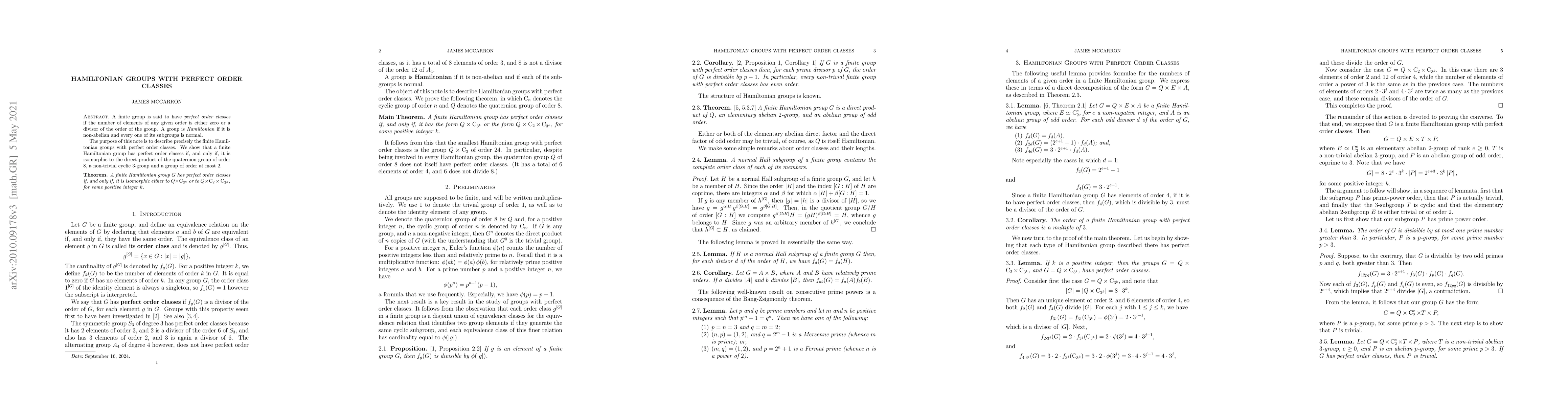 A finite group is said to have "perfect order classes" if the number of elements of any given order is either zero or a divisor of the order of the group. The purpose of this note is to describe explicitly the finite Hamiltonian groups with perfect order classes. We show that a finite Hamiltonian group has perfect order classes if, and only if, it is isomorphic to the direct product of the quaternion group of order $8$, a non-trivial cyclic $3$-group and a group of order at most $2$. Theorem. A finite Hamiltonian group has perfect order classes if, and only if, it is isomorphic either to $Q\times C_{3^k}$ or to $Q\times C_{2}\times C_{3^k}$, for some positive integer $k$.