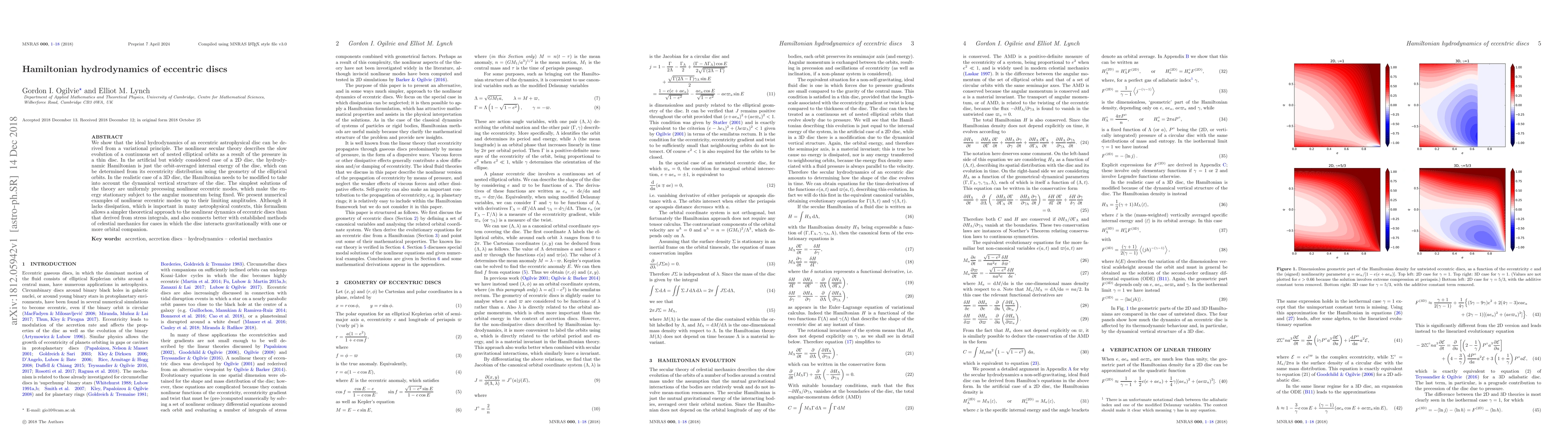 We show that the ideal hydrodynamics of an eccentric astrophysical disc can be derived from a variational principle. The nonlinear secular theory describes the slow evolution of a continuous set of nested elliptical orbits as a result of the pressure in a thin disc. In the artificial but widely considered case of a 2D disc, the hydrodynamic Hamiltonian is just the orbit-averaged internal energy of the disc, which can be determined from its eccentricity distribution using the geometry of the elliptical orbits. In the realistic case of a 3D disc, the Hamiltonian needs to be modified to take into account the dynamical vertical structure of the disc. The simplest solutions of the theory are uniformly precessing nonlinear eccentric modes, which make the energy stationary subject to the angular momentum being fixed. We present numerical examples of nonlinear eccentric modes up to their limiting amplitudes. Although it lacks dissipation, which is important in many astrophysical contexts, this formalism allows a simpler theoretical approach to the nonlinear dynamics of eccentric discs than that derived from stress integrals, and also connects better with established methods of celestial mechanics for cases in which the disc interacts gravitationally with one or more orbital companion.