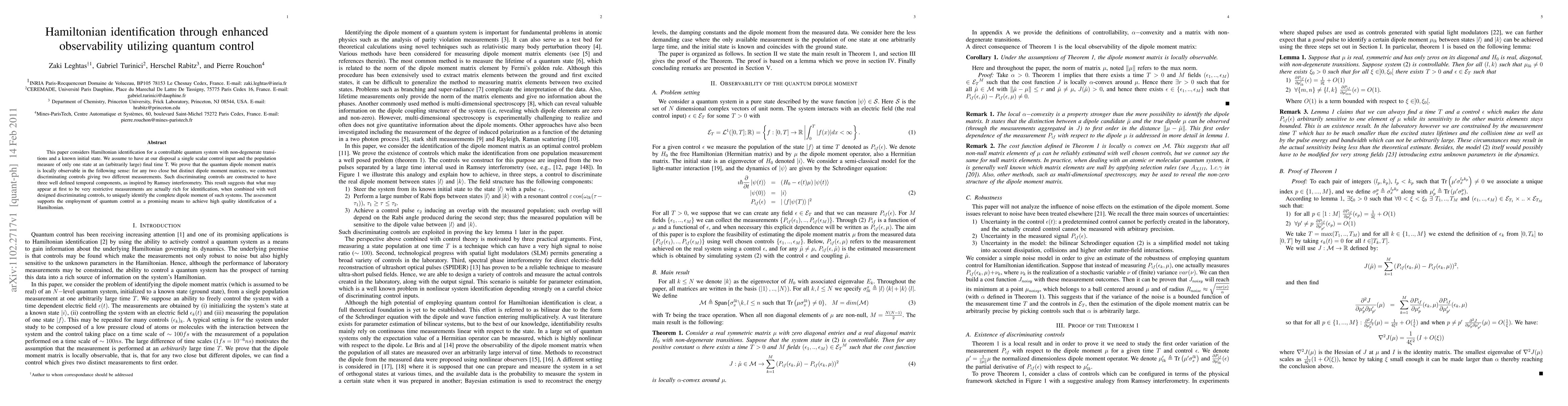 This paper considers Hamiltonian identification for a controllable quantum system with non-degenerate transitions and a known initial state. We assume to have at our disposal a single scalar control input and the population measure of only one state at an (arbitrarily large) final time T. We prove that the quantum dipole moment matrix is locally observable in the following sense: for any two close but distinct dipole moment matrices, we construct discriminating controls giving two different measurements. Such discriminating controls are constructed to have three well defined temporal components, as inspired by Ramsey interferometry. This result suggests that what may appear at first to be very restrictive measurements are actually rich for identification, when combined with well designed discriminating controls, to uniquely identify the complete dipole moment of such systems. The assessment supports the employment of quantum control as a promising means to achieve high quality identification of a Hamiltonian.