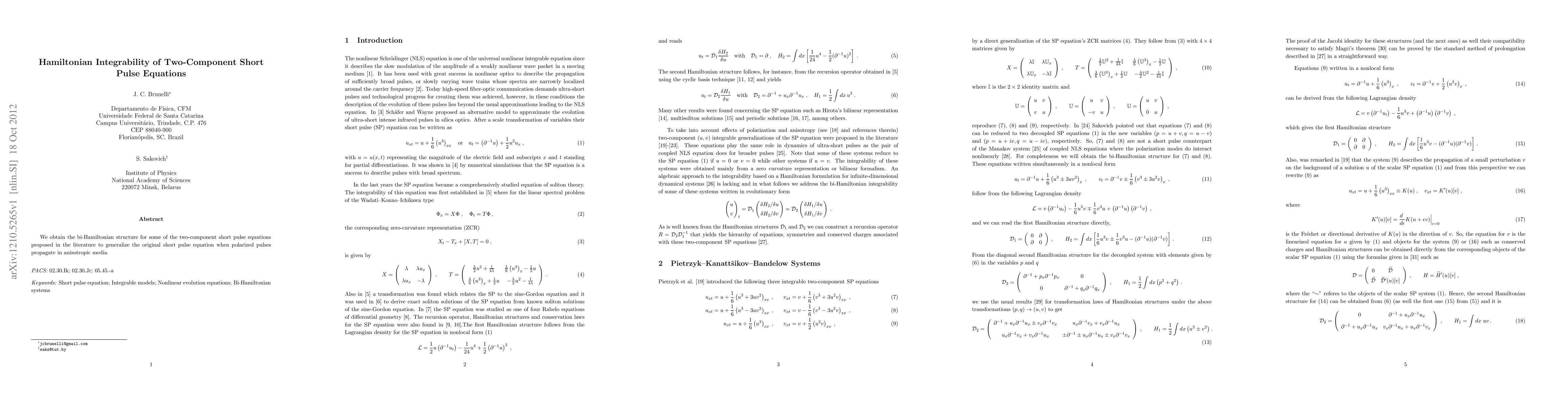 Summary: The paper establishes the bi-Hamiltonian structure for two-component short pulse equations used to model polarized pulses in anisotropic media, highlighting their integrability properties. This provides a deeper understanding of the underlying dynamics of such pulses.
