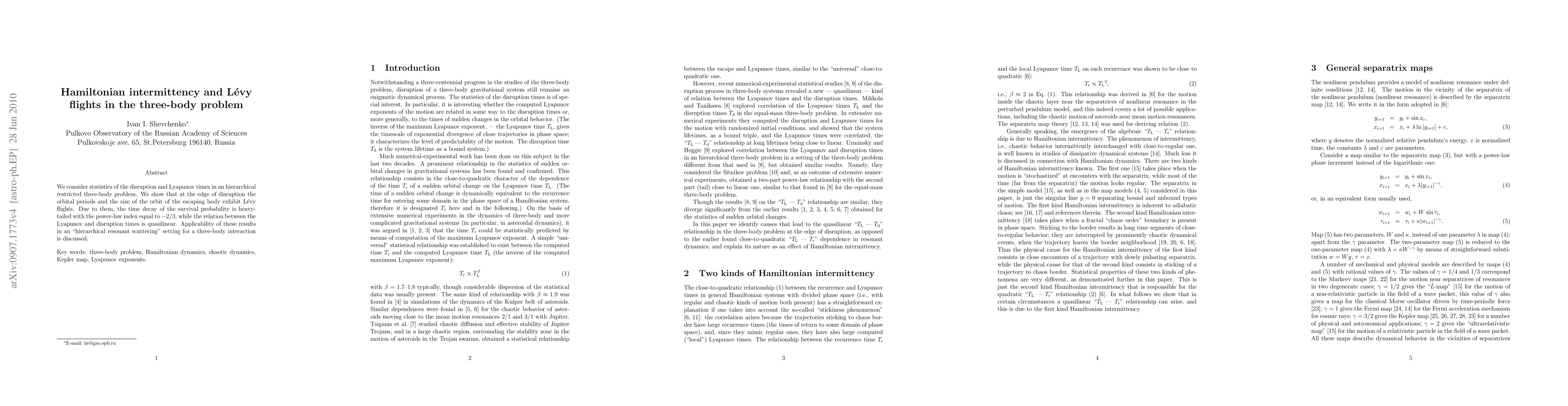 We consider statistics of the disruption and Lyapunov times in an hierarchical restricted three-body problem. We show that at the edge of disruption the orbital periods and the size of the orbit of the escaping body exhibit L\'evy flights. Due to them, the time decay of the survival probability is heavy-tailed with the power-law index equal to -2/3, while the relation between the Lyapunov and disruption times is quasilinear. Applicability of these results in an "hierarchical resonant scattering" setting for a three-body interaction is discussed.