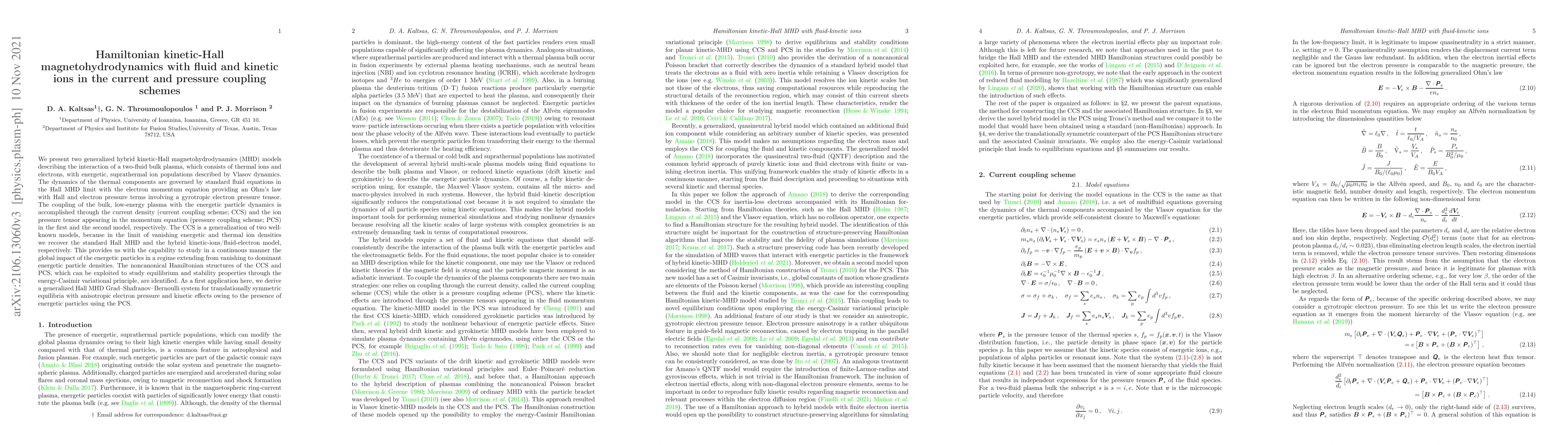 We present two generalized hybrid kinetic-Hall magnetohydrodynamics (MHD) models describing the interaction of a two-fluid bulk plasma, which consists of thermal ions and electrons, with energetic, suprathermal ion populations described by Vlasov dynamics. The dynamics of the thermal components are governed by standard fluid equations in the Hall MHD limit with the electron momentum equation providing an Ohm's law with Hall and electron pressure terms involving a gyrotropic electron pressure tensor. The coupling of the bulk, low-energy plasma with the energetic particle dynamics is accomplished through the current density (current coupling scheme; CCS) and the ion pressure tensor appearing in the momentum equation (pressure coupling scheme; PCS) in the first and the second model, respectively. The CCS is a generalization of two well-known models, because in the limit of vanishing energetic and thermal ion densities we recover the standard Hall MHD and the hybrid kinetic-ions/fluid-electron model, respectively. This provides us with the capability to study in a continuous manner the global impact of the energetic particles in a regime extending from vanishing to dominant energetic particle densities. The noncanonical Hamiltonian structures of the CCS and PCS, which can be exploited to study equilibrium and stability properties through the energy-Casimir variational principle, are identified. As a first application here, we derive a generalized Hall MHD Grad--Shafranov--Bernoulli system for translationally symmetric equilibria with anisotropic electron pressure and kinetic effects owing to the presence of energetic particles using the PCS.