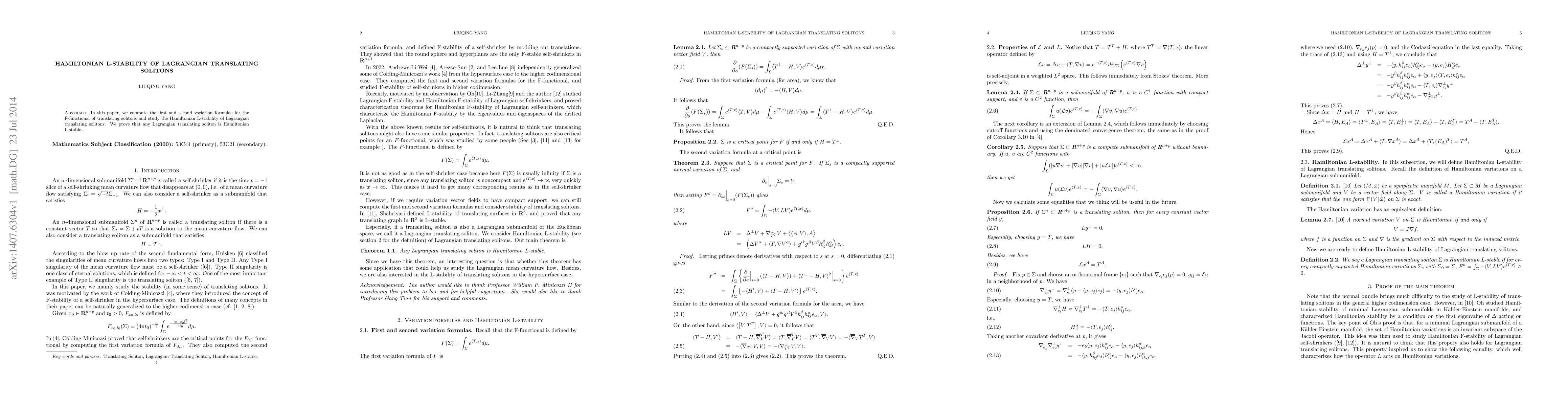 This paper computes the first and second variation formulas for the F-functional of translating solitons and proves the Hamiltonian L-stability of Lagrangian translating solitons, establishing that any such soliton maintains stability under Hamiltonian perturbations.