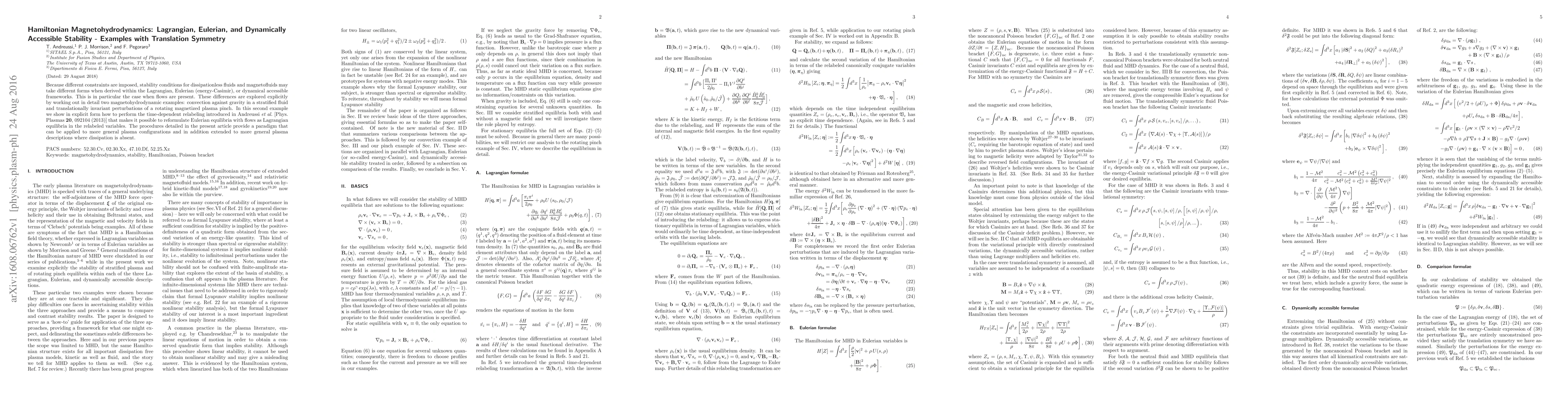 This paper explores stability conditions for magnetohydrodynamics under different frameworks, specifically Lagrangian, Eulerian, and dynamical accessible approaches, using two examples: convection in a stratified fluid and translationally invariant perturbations of a rotating magnetized plasma pinch. It details a method to reformulate Eulerian equilibria with flows as Lagrangian equilibria.