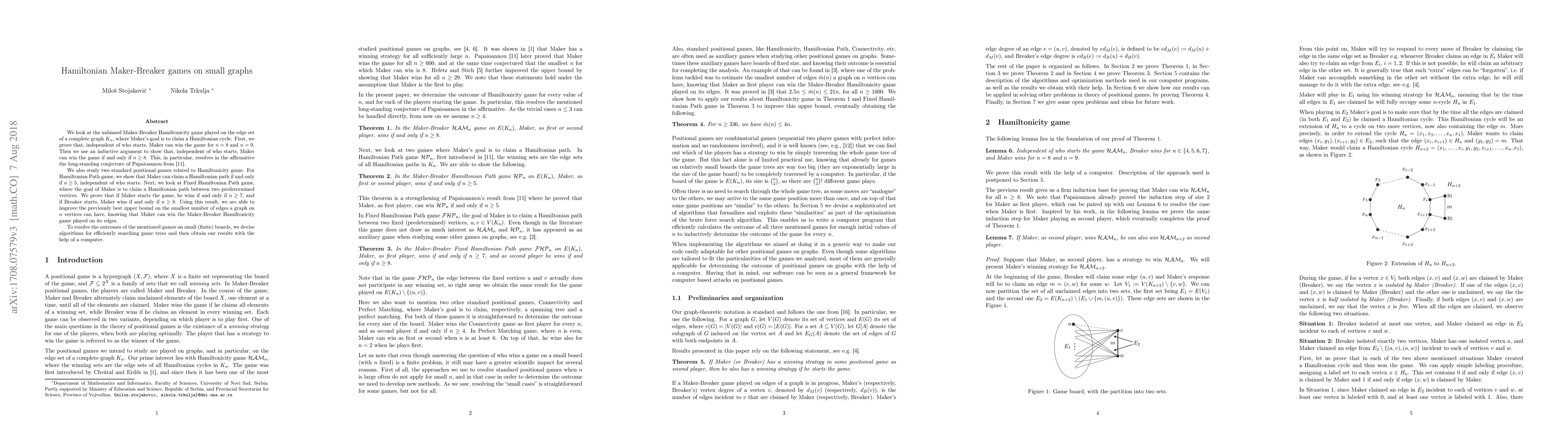 We look at the unbiased Maker-Breaker Hamiltonicity game played on the edge set of a complete graph $K_n$, where Maker's goal is to claim a Hamiltonian cycle. First, we prove that, independent of who starts, Maker can win the game for $n = 8$ and $n = 9$. Then we use an inductive argument to show that, independent of who starts, Maker can win the game if and only if $n \geq 8$. This, in particular, resolves in the affirmative the long-standing conjecture of Papaioannou. We also study two standard positional games related to Hamiltonicity game. For Hamiltonian Path game, we show that Maker can claim a Hamiltonian path if and only if $n \geq 5$, independent of who starts. Next, we look at Fixed Hamiltonian Path game, where the goal of Maker is to claim a Hamiltonian path between two predetermined vertices. We prove that if Maker starts the game, he wins if and only if $n \geq 7$, and if Breaker starts, Maker wins if and only if $n \geq 8$. Using this result, we are able to improve the previously best upper bound on the smallest number of edges a graph on $n$ vertices can have, knowing that Maker can win the Maker-Breaker Hamiltonicity game played on its edges. To resolve the outcomes of the mentioned games on small (finite) boards, we devise algorithms for efficiently searching game trees and then obtain our results with the help of a computer.