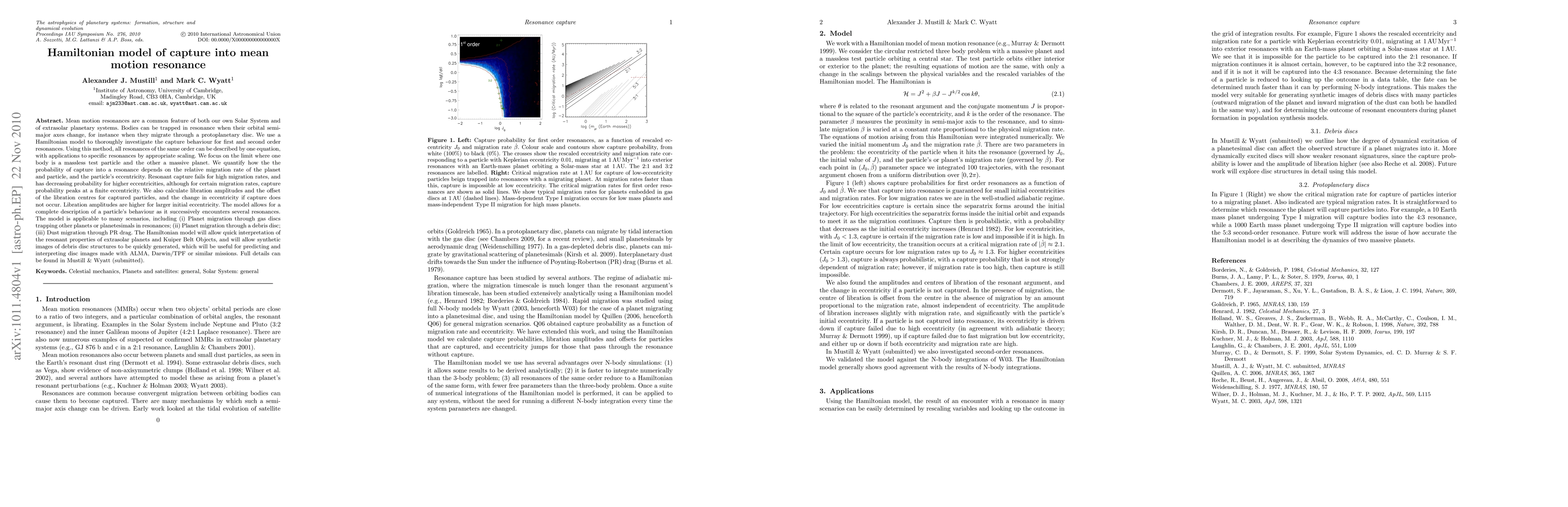 This paper develops a Hamiltonian model to study the capture of bodies into mean motion resonances, focusing on the probability of capture depending on migration rates and eccentricity. It finds that capture probability decreases with higher migration rates and eccentricity, but peaks at certain rates for finite eccentricity, and provides detailed descriptions of libration amplitudes and particle behavior.