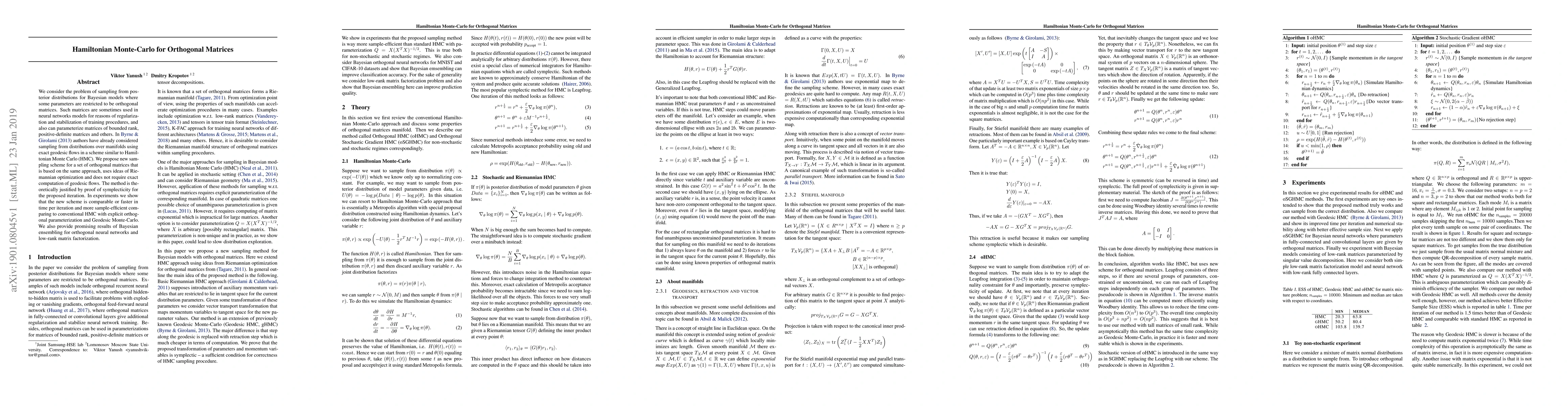 We consider the problem of sampling from posterior distributions for Bayesian models where some parameters are restricted to be orthogonal matrices. Such matrices are sometimes used in neural networks models for reasons of regularization and stabilization of training procedures, and also can parameterize matrices of bounded rank, positive-definite matrices and others. In \citet{byrne2013geodesic} authors have already considered sampling from distributions over manifolds using exact geodesic flows in a scheme similar to Hamiltonian Monte Carlo (HMC). We propose new sampling scheme for a set of orthogonal matrices that is based on the same approach, uses ideas of Riemannian optimization and does not require exact computation of geodesic flows. The method is theoretically justified by proof of symplecticity for the proposed iteration. In experiments we show that the new scheme is comparable or faster in time per iteration and more sample-efficient comparing to conventional HMC with explicit orthogonal parameterization and Geodesic Monte-Carlo. We also provide promising results of Bayesian ensembling for orthogonal neural networks and low-rank matrix factorization.
