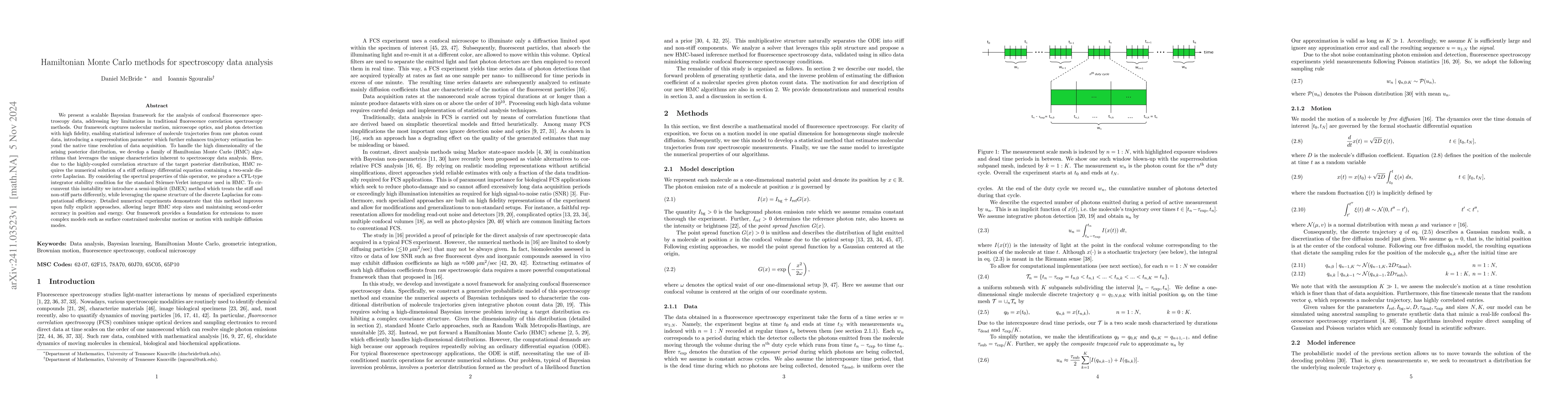 We present a scalable Bayesian framework for the analysis of confocal fluorescence spectroscopy data, addressing key limitations in traditional fluorescence correlation spectroscopy methods. Our framework captures molecular motion, microscope optics, and photon detection with high fidelity, enabling statistical inference of molecule trajectories from raw photon count data, introducing a superresolution parameter which further enhances trajectory estimation beyond the native time resolution of data acquisition. To handle the high dimensionality of the arising posterior distribution, we develop a family of Hamiltonian Monte Carlo (HMC) algorithms that leverages the unique characteristics inherent to spectroscopy data analysis. Here, due to the highly-coupled correlation structure of the target posterior distribution, HMC requires the numerical solution of a stiff ordinary differential equation containing a two-scale discrete Laplacian. By considering the spectral properties of this operator, we produce a CFL-type integrator stability condition for the standard St\"ormer-Verlet integrator used in HMC. To circumvent this instability we introduce a semi-implicit (IMEX) method which treats the stiff and non-stiff parts differently, while leveraging the sparse structure of the discrete Laplacian for computational efficiency. Detailed numerical experiments demonstrate that this method improves upon fully explicit approaches, allowing larger HMC step sizes and maintaining second-order accuracy in position and energy. Our framework provides a foundation for extensions to more complex models such as surface constrained molecular motion or motion with multiple diffusion modes.