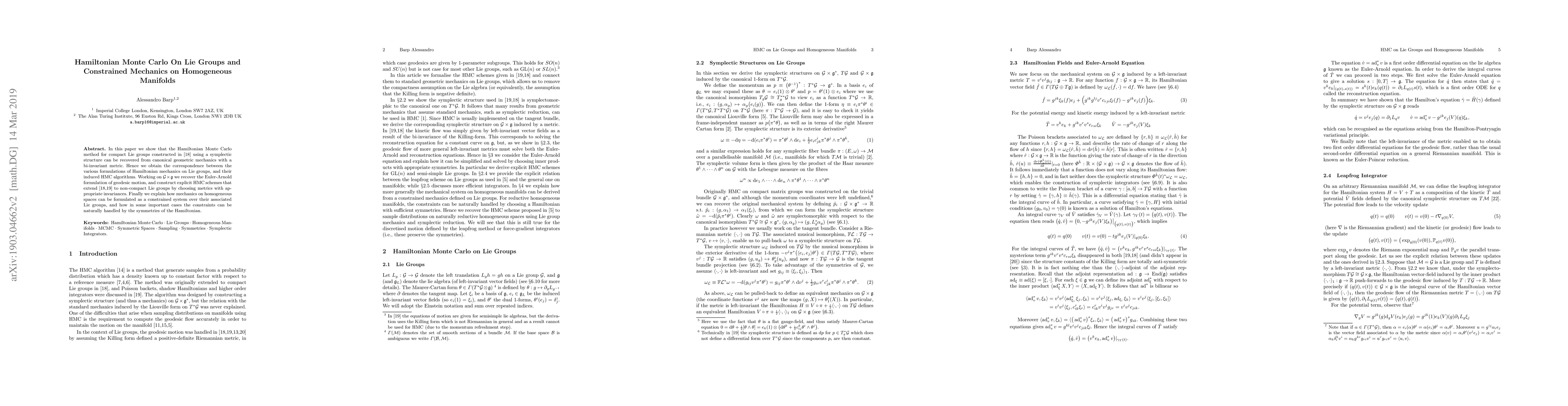 This paper establishes a connection between Hamiltonian Monte Carlo (HMC) on compact Lie groups and canonical geometric mechanics using bi-invariant metrics, extending HMC formulations to non-compact groups and discussing mechanics on homogeneous spaces as constrained systems.
