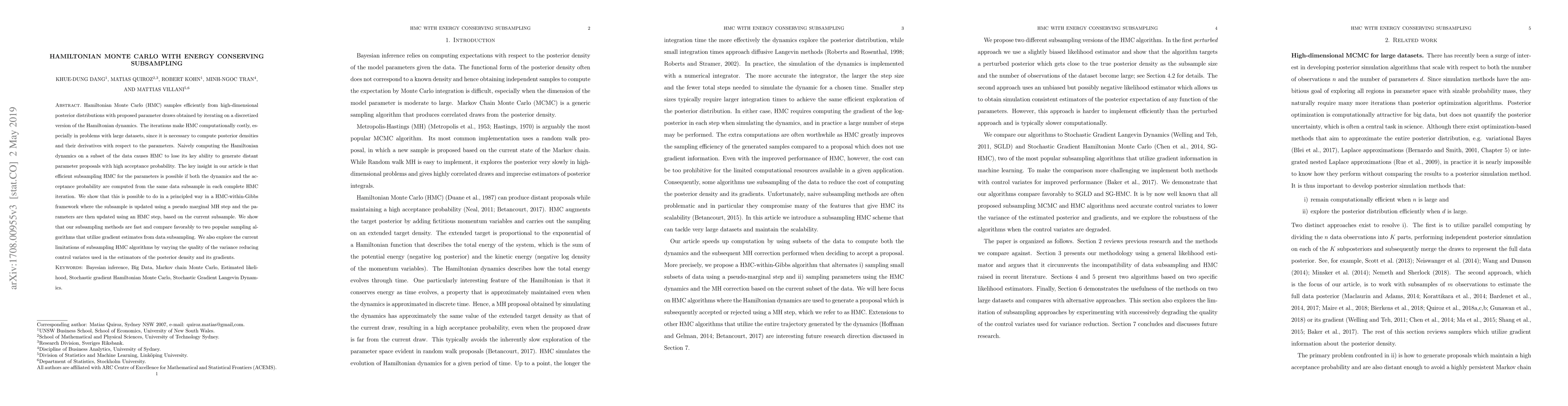 Hamiltonian Monte Carlo can now efficiently sample from high-dimensional posterior distributions using a subsampling method that updates both the dynamics and acceptance probability from the same data subset.