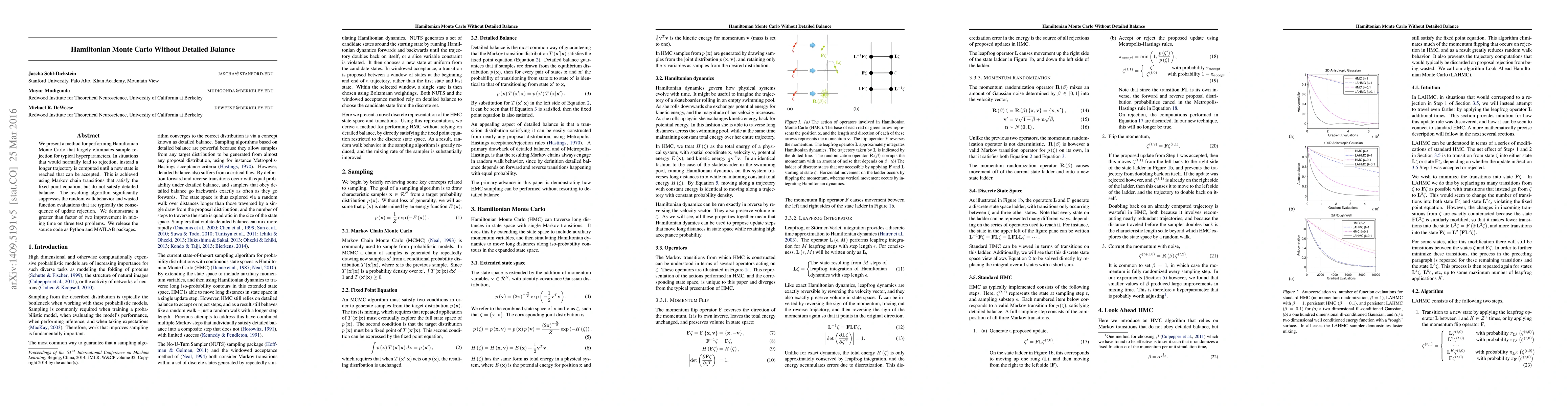 This paper introduces a novel Hamiltonian Monte Carlo method that avoids sample rejection by extending trajectories instead of discarding them, leading to improved mixing time and reduced wasted function evaluations. The method satisfies the fixed point equation but does not require detailed balance, achieving over a twofold improvement in mixing on test problems.