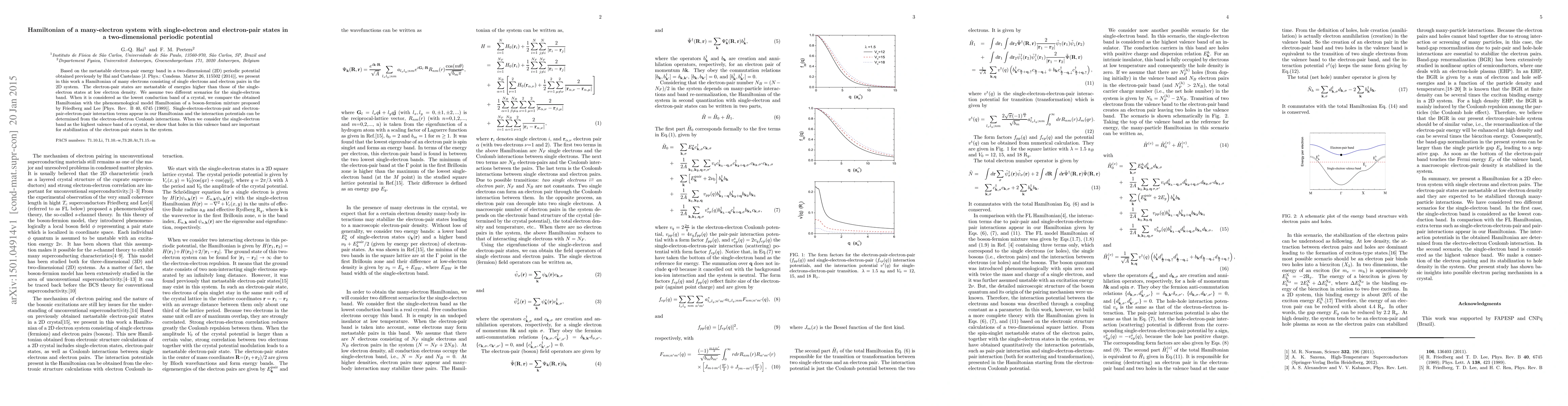 This paper constructs a Hamiltonian for a many-electron system in a two-dimensional periodic potential, incorporating both single-electron and metastable electron-pair states. It explores the implications of two scenarios for the single-electron band and compares the derived Hamiltonian with a boson-fermion mixture model.